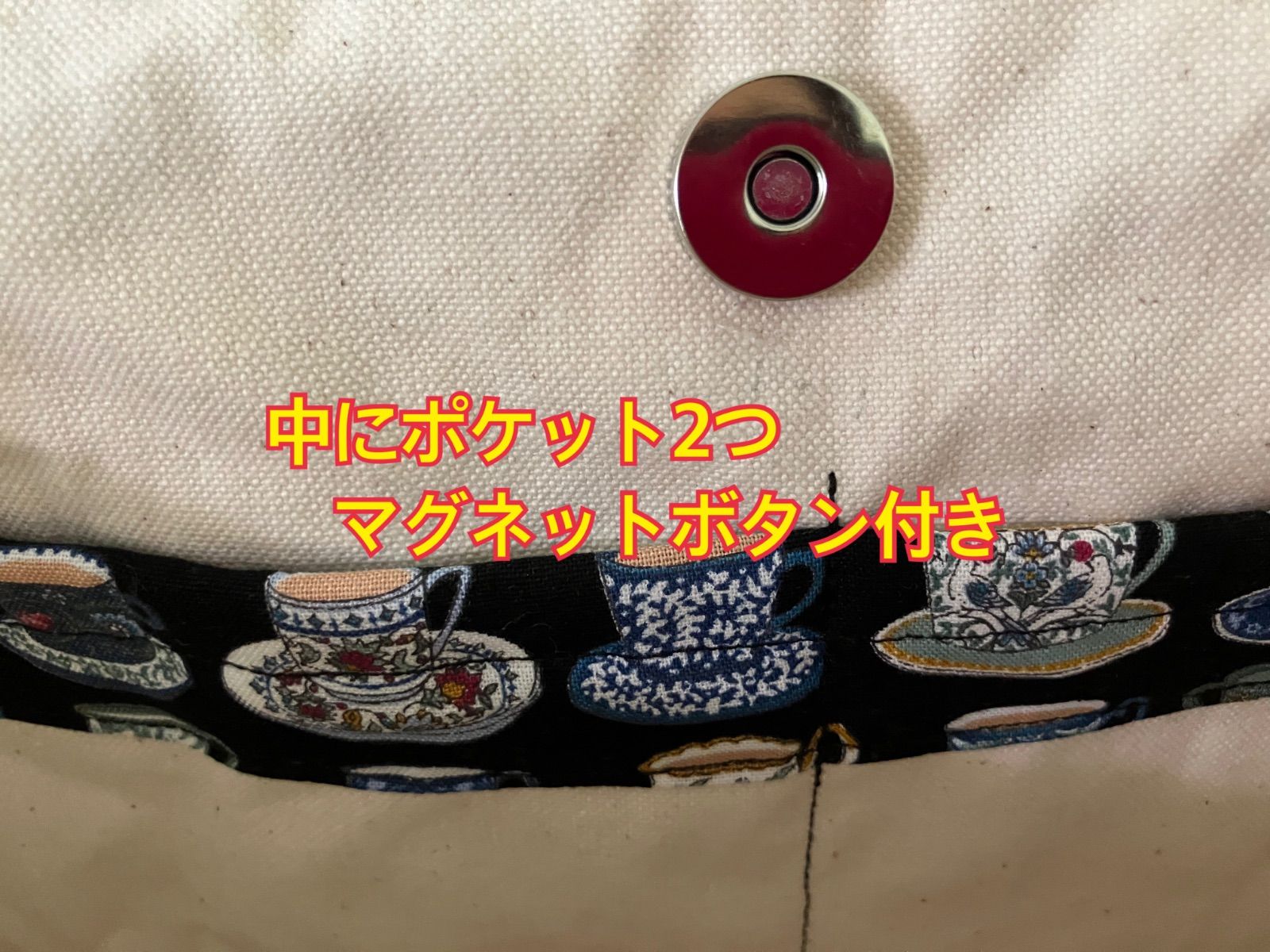 中にはポケットが2つあります、大きくて深いので携帯や小物が沢山入ります。