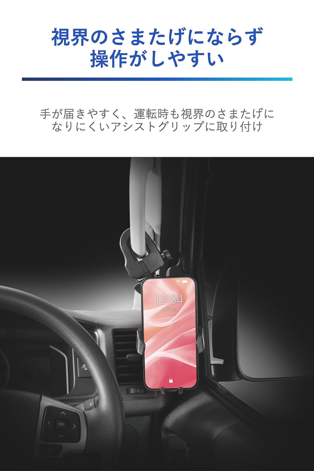 【 アシストグリップ取り付けで視界がスッキリ 】視界の妨げにならずスマートフォンが操作しやすい位置に取り付けられるスマートフォンホルダーです。※運転中のスマートフォン等の操作や画面注視は法律で禁止されています。安全な場所に停車してから操作してください。