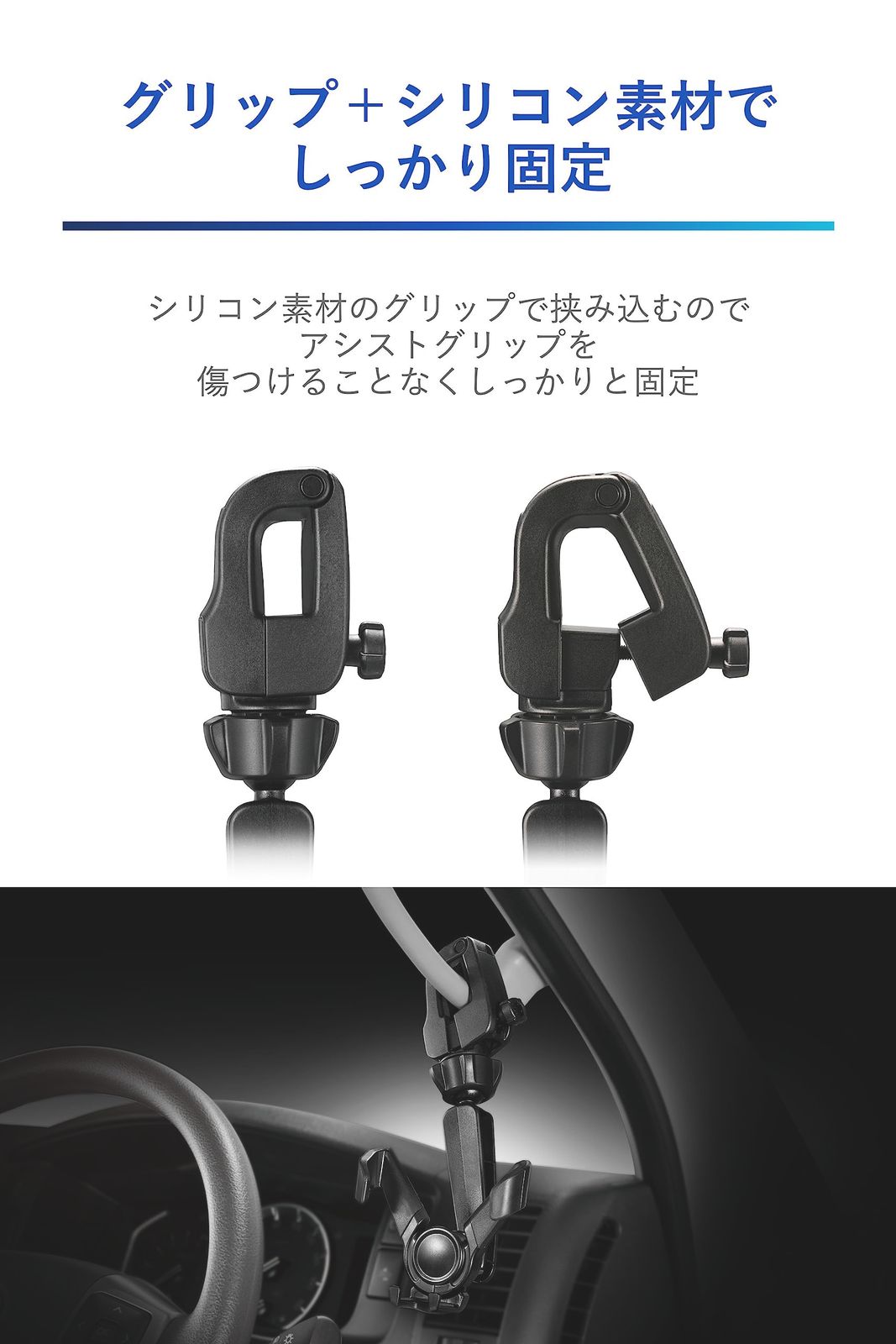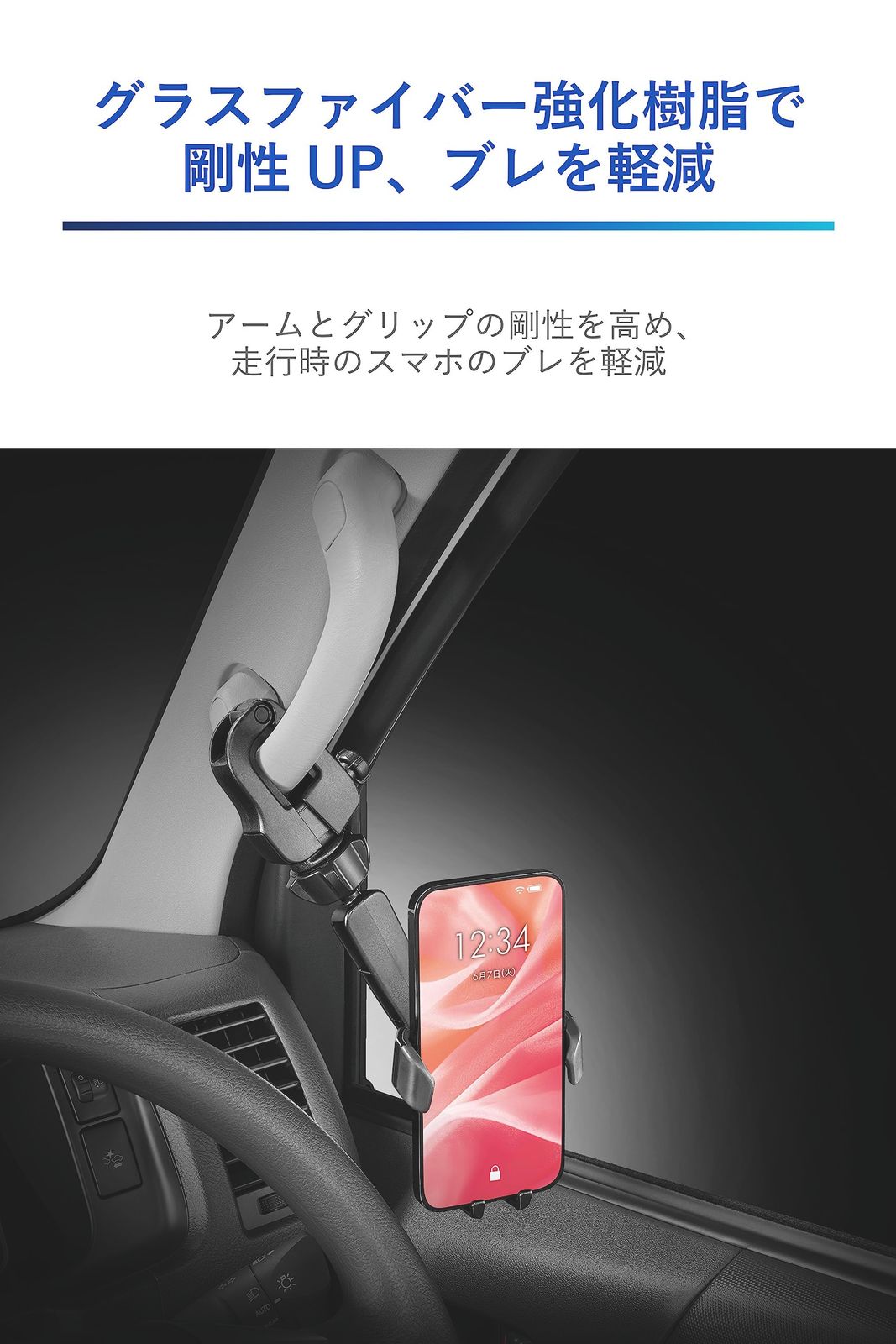 【 グラスファイバー強化樹脂※を採用、剛性感のあるグリップでしっかり固定 】・太さが16~28mmのアシストグリップに対応したグリップであらゆる車種にしっかりと固定することができます。・剛性のあるグリップとアームが運転時のスマートフォンのブレを軽減します。※アームとグリップの表面にはグラスファイバー強化樹脂特有の模様が出る場合があります。