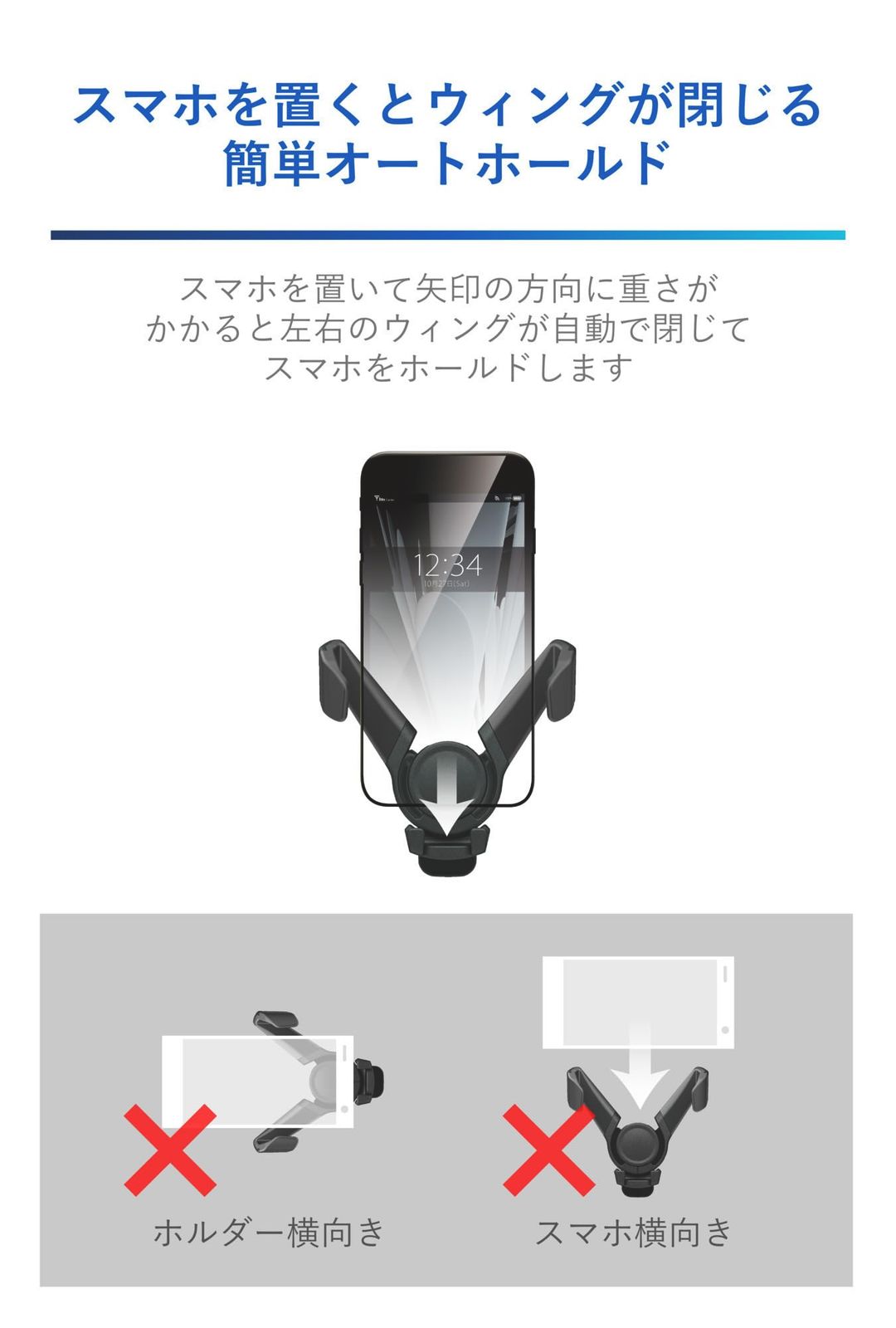 【 置くだけカンタンのウイングキャッチ 】スマートフォンを置くと左右のウィングが自動的に閉じてホールドできます。スマートフォン背面に落下防止リングなどのアクセサリーを付けたままでもホールドできます。(装着位置によります) ※スマートフォンを横向きにしてホールドできません。