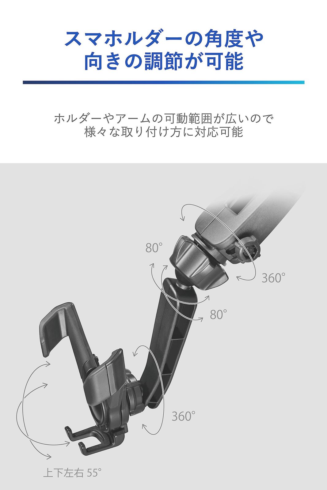 ・ホルダー部とベースをボールジョイントで接合することにより、上下左右55°角度調整ができます。また、ダイヤルを緩めることでアームの角度を上下左右80°角度調整することができます。