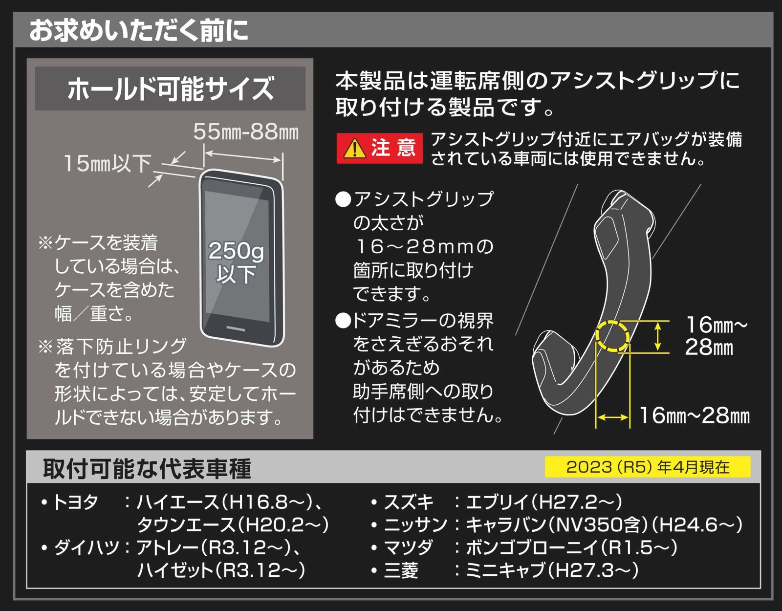 ・太さが16~28mmのアシストグリップに対応したグリップであらゆる車種にしっかりと固定することができます。