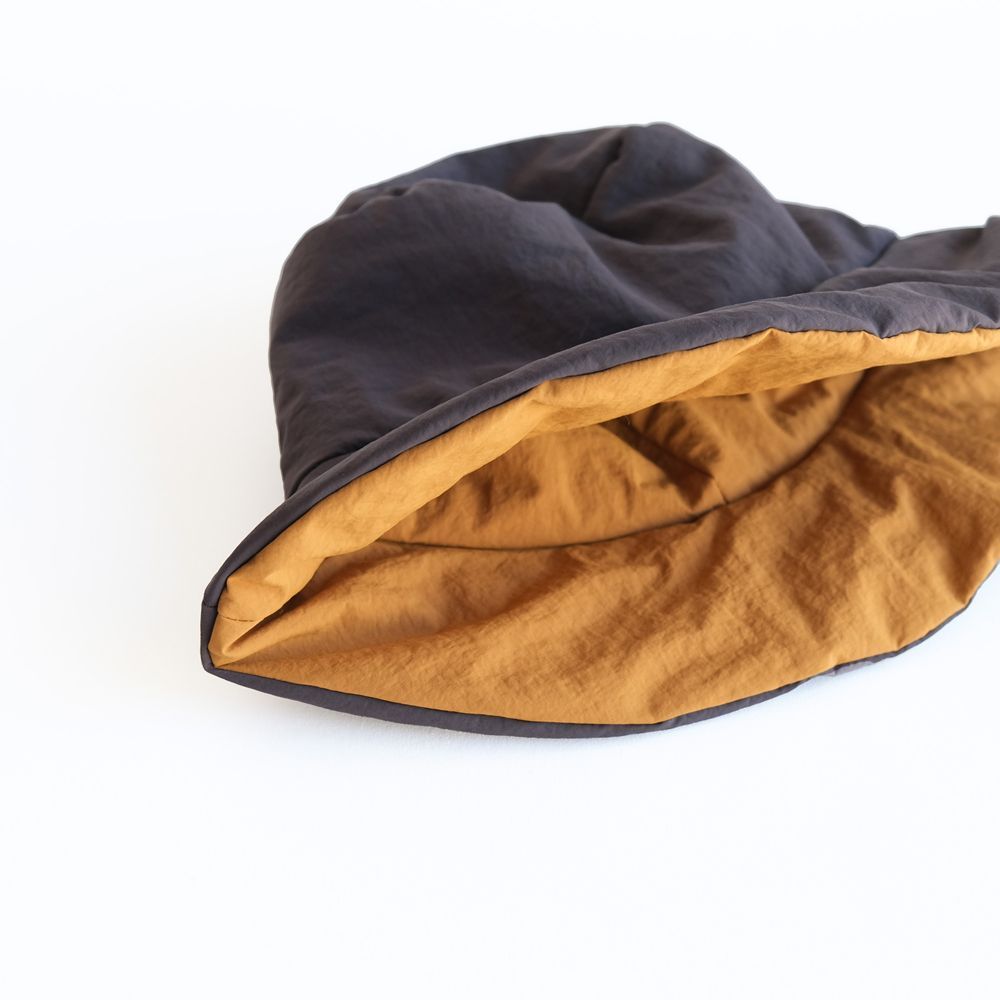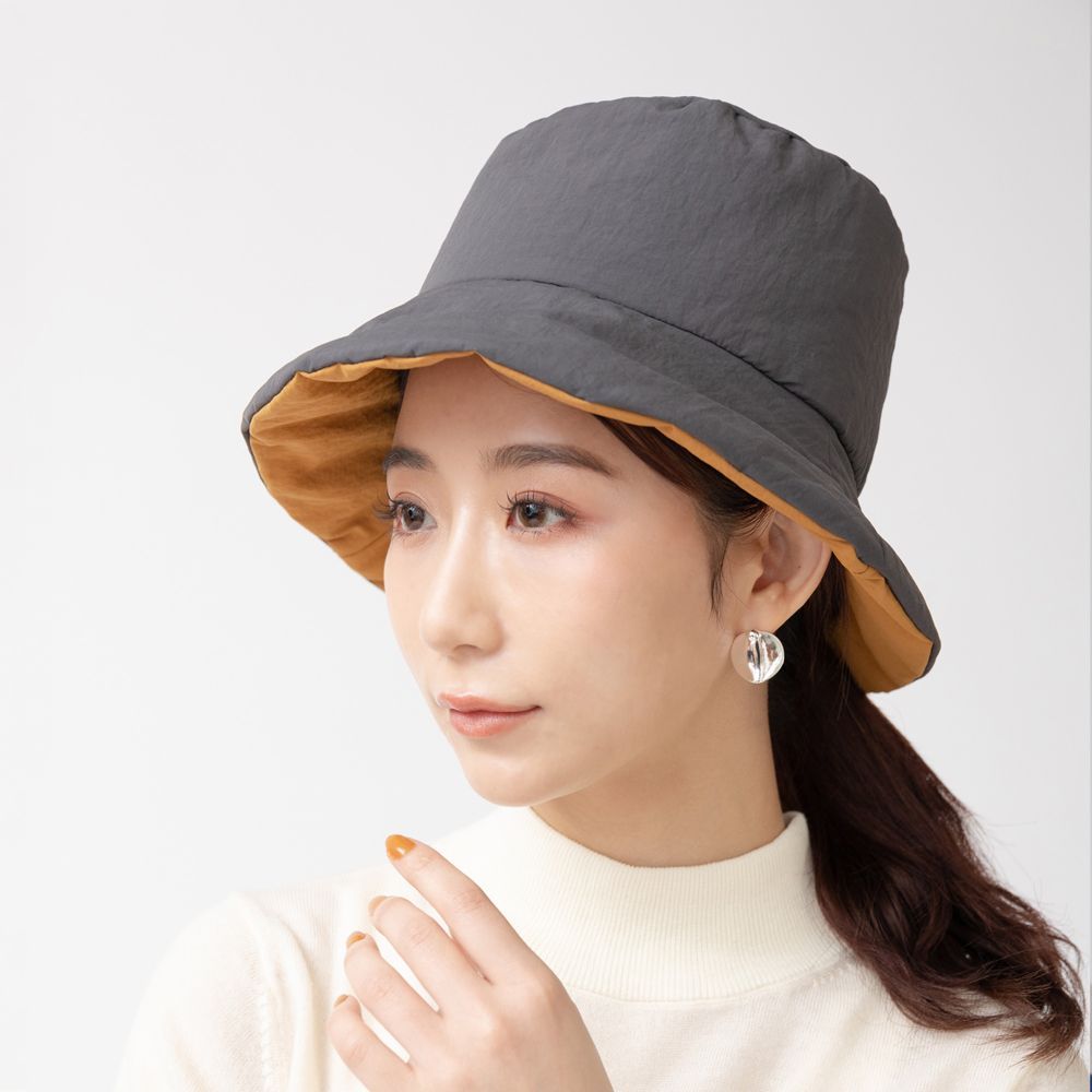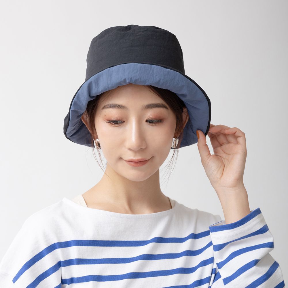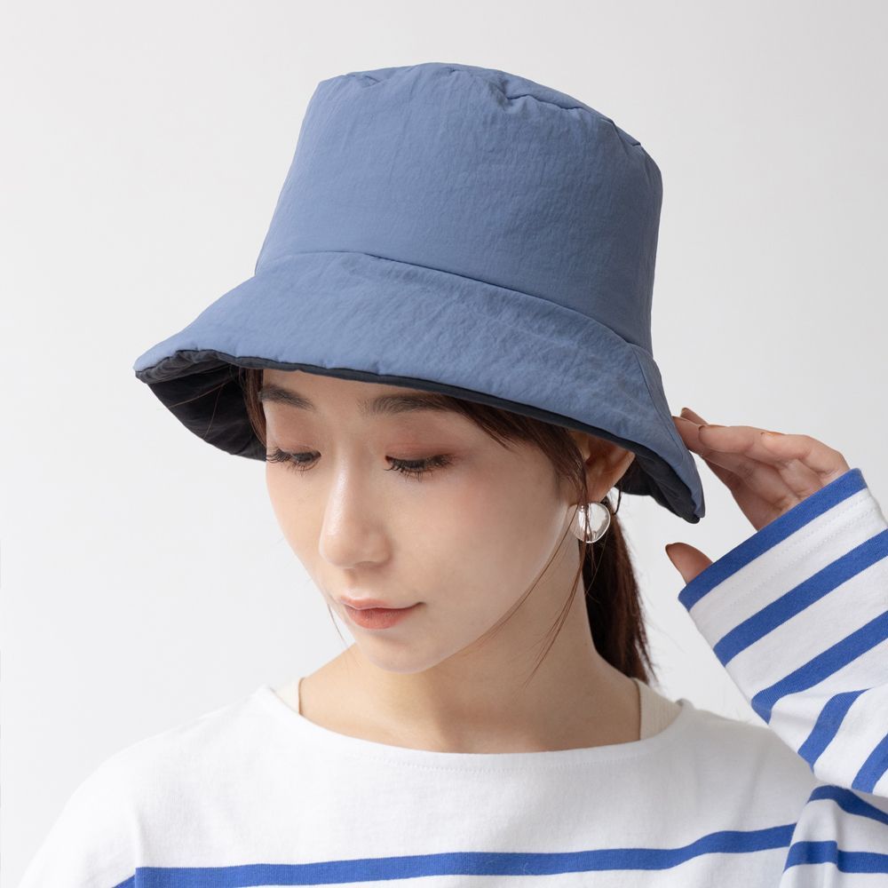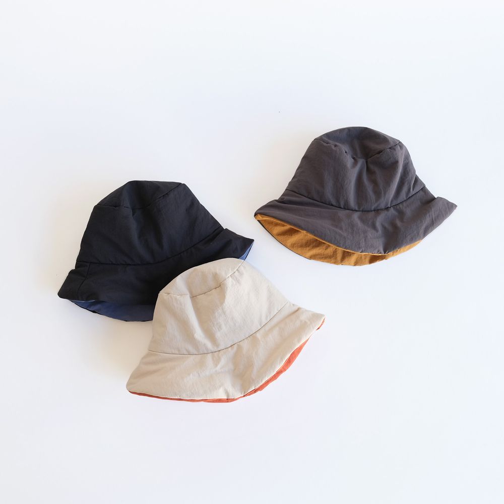 注目のバケットハットは、中綿を入れてバイカラーのリバーシブル仕立てにしています。その名の通り、バケツを逆さに返した台形のフォルムに短めのブリムがついたデザイン。メンズライクでカジュアルな印象もありますが、以外とフェミニンなワンピースやスカートとも相性がいいので、ワードローブに加えて損のないアイテム。軽くてシワも気にならないナイロン素材、深めにかぶれば小顔効果も抜群です。