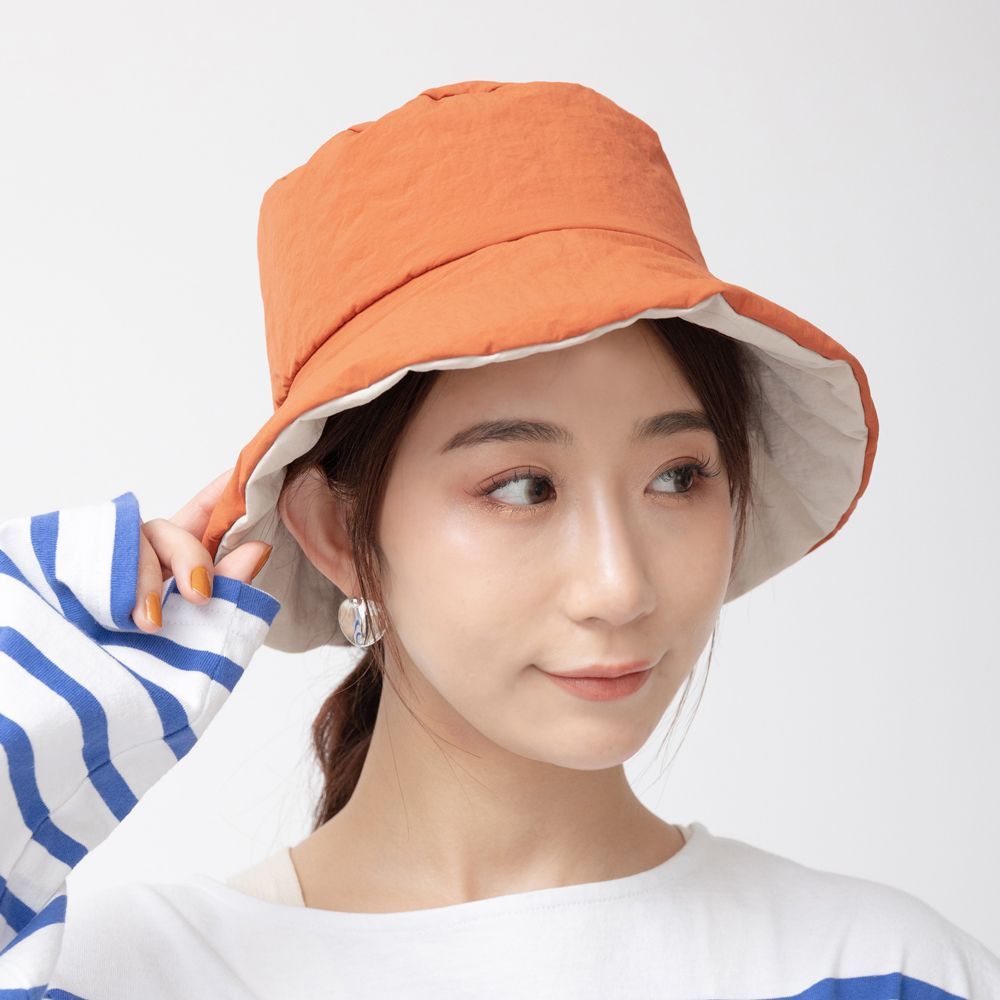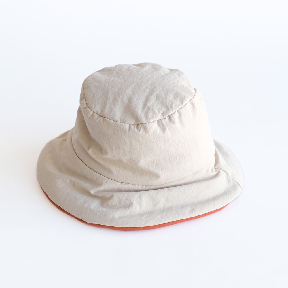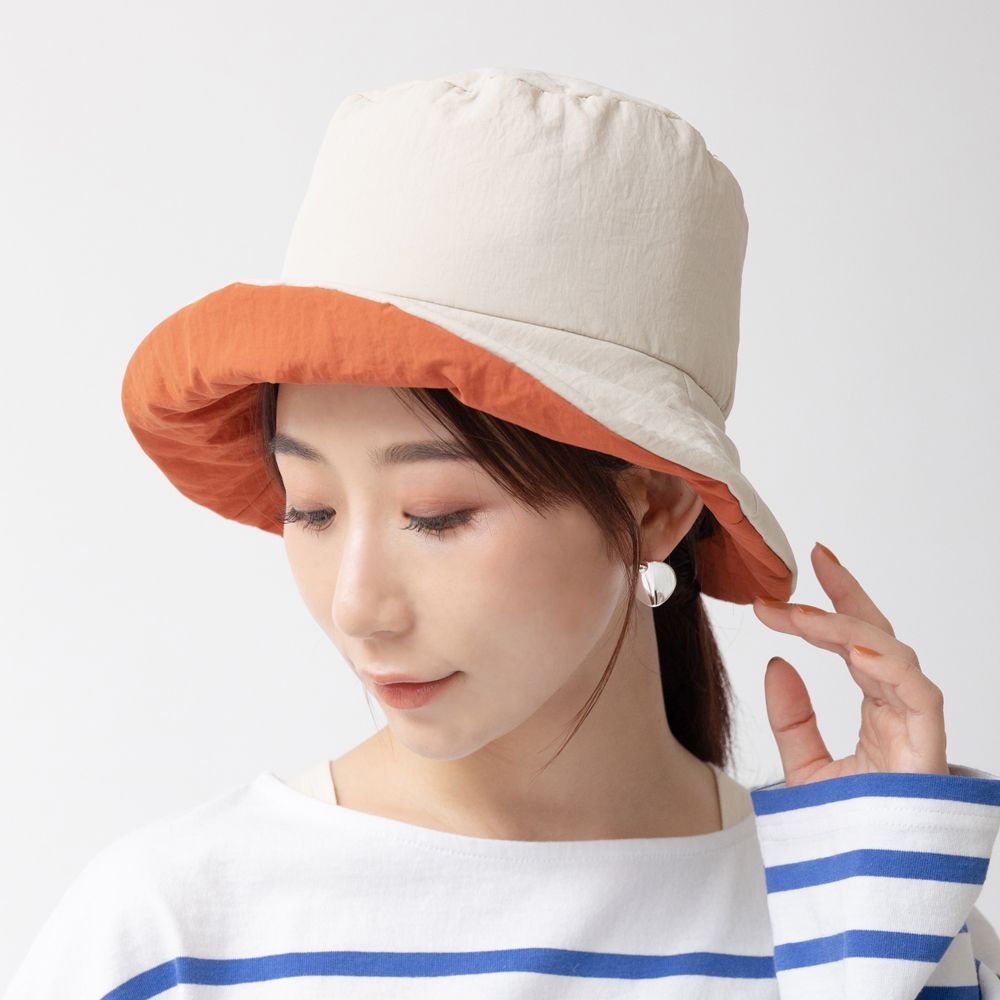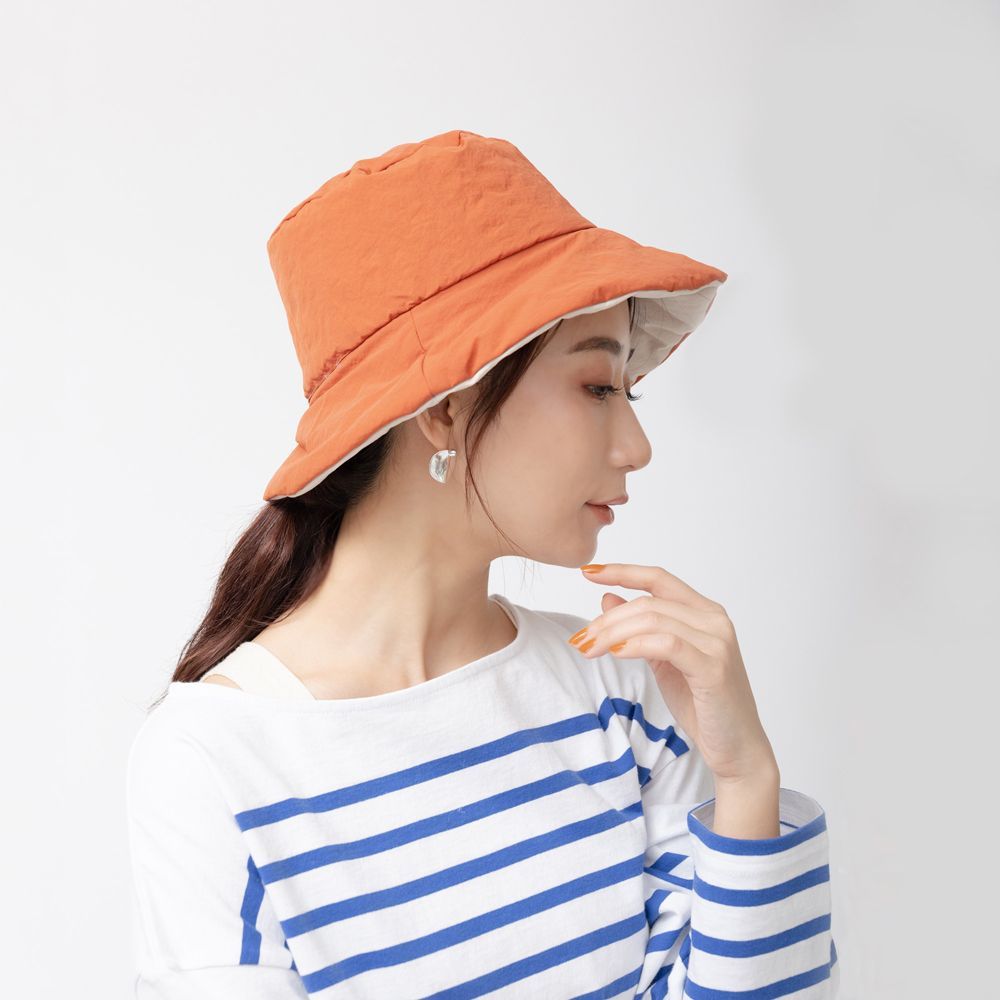 注目のバケットハットは、中綿を入れてバイカラーのリバーシブル仕立てにしています。その名の通り、バケツを逆さに返した台形のフォルムに短めのブリムがついたデザイン。メンズライクでカジュアルな印象もありますが、以外とフェミニンなワンピースやスカートとも相性がいいので、ワードローブに加えて損のないアイテム。軽くてシワも気にならないナイロン素材、深めにかぶれば小顔効果も抜群です。