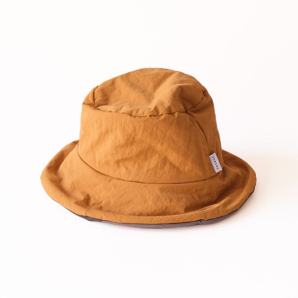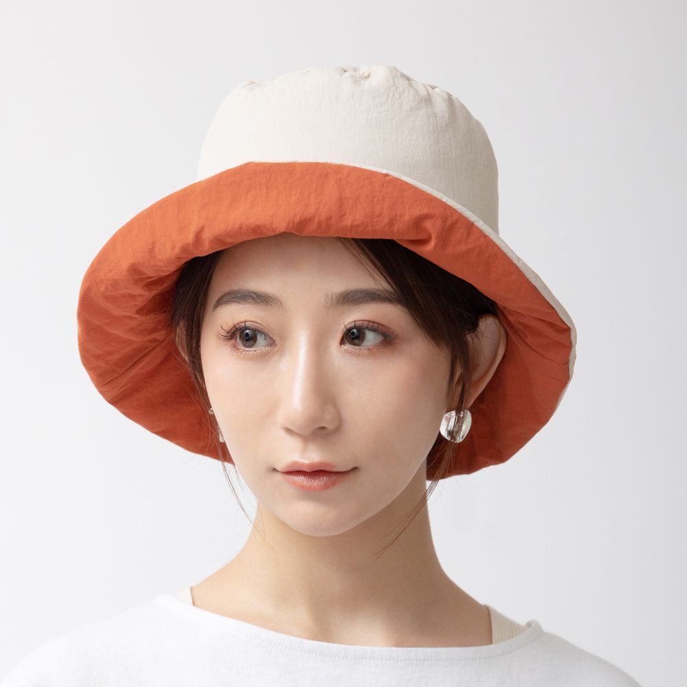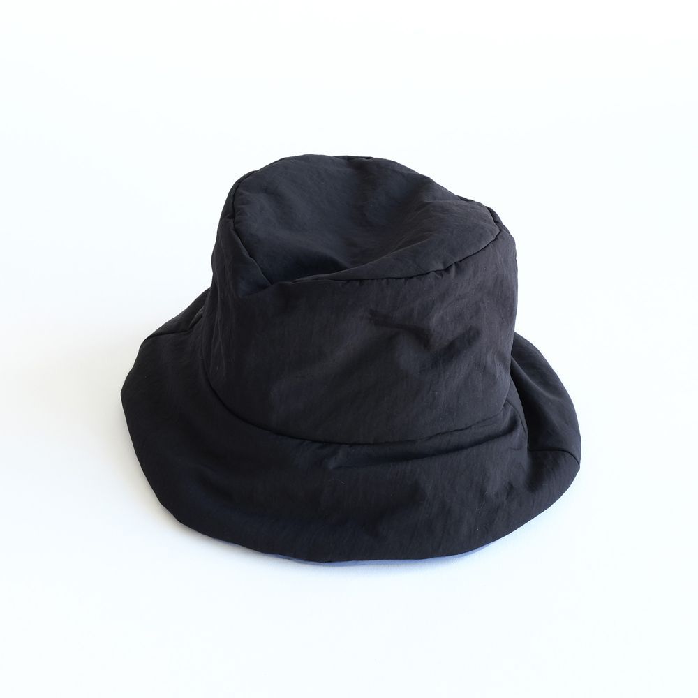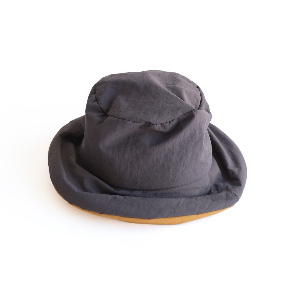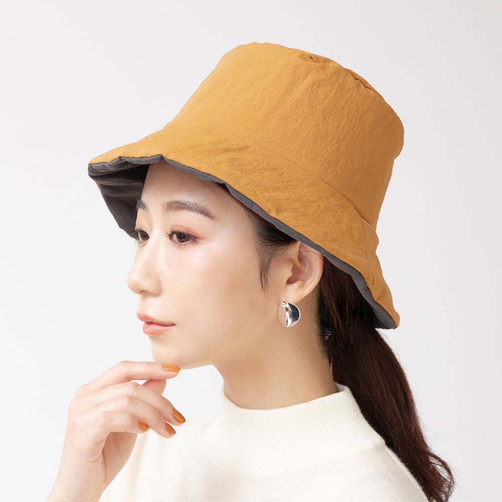 注目のバケットハットは、中綿を入れてバイカラーのリバーシブル仕立てにしています。その名の通り、バケツを逆さに返した台形のフォルムに短めのブリムがついたデザイン。メンズライクでカジュアルな印象もありますが、以外とフェミニンなワンピースやスカートとも相性がいいので、ワードローブに加えて損のないアイテム。軽くてシワも気にならないナイロン素材、深めにかぶれば小顔効果も抜群です。