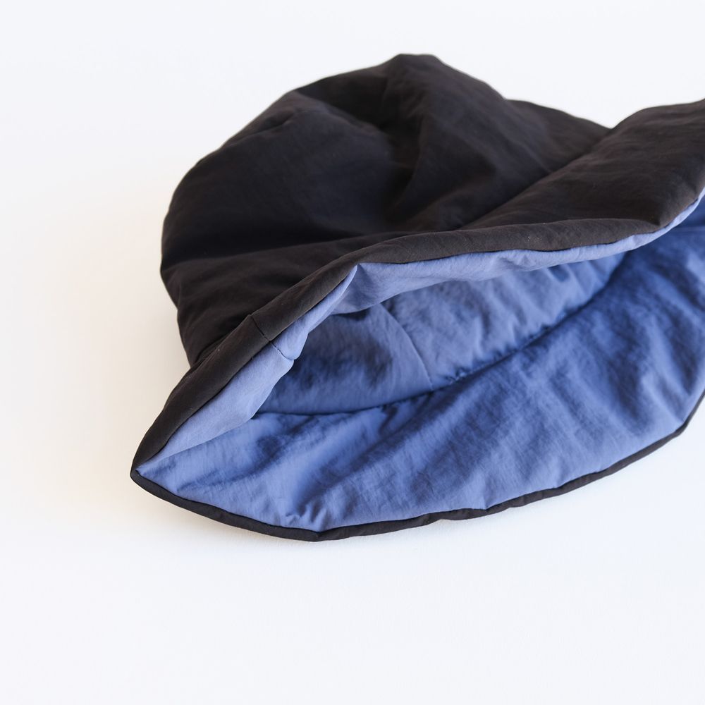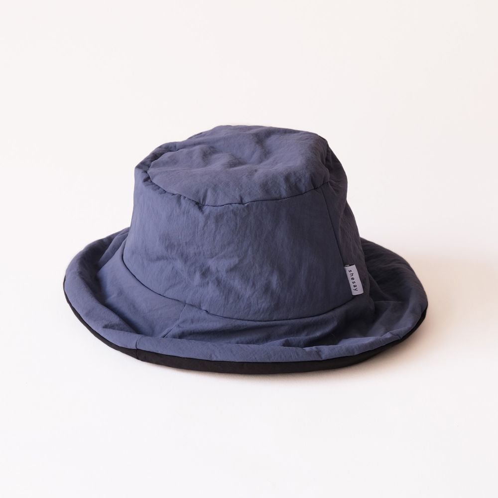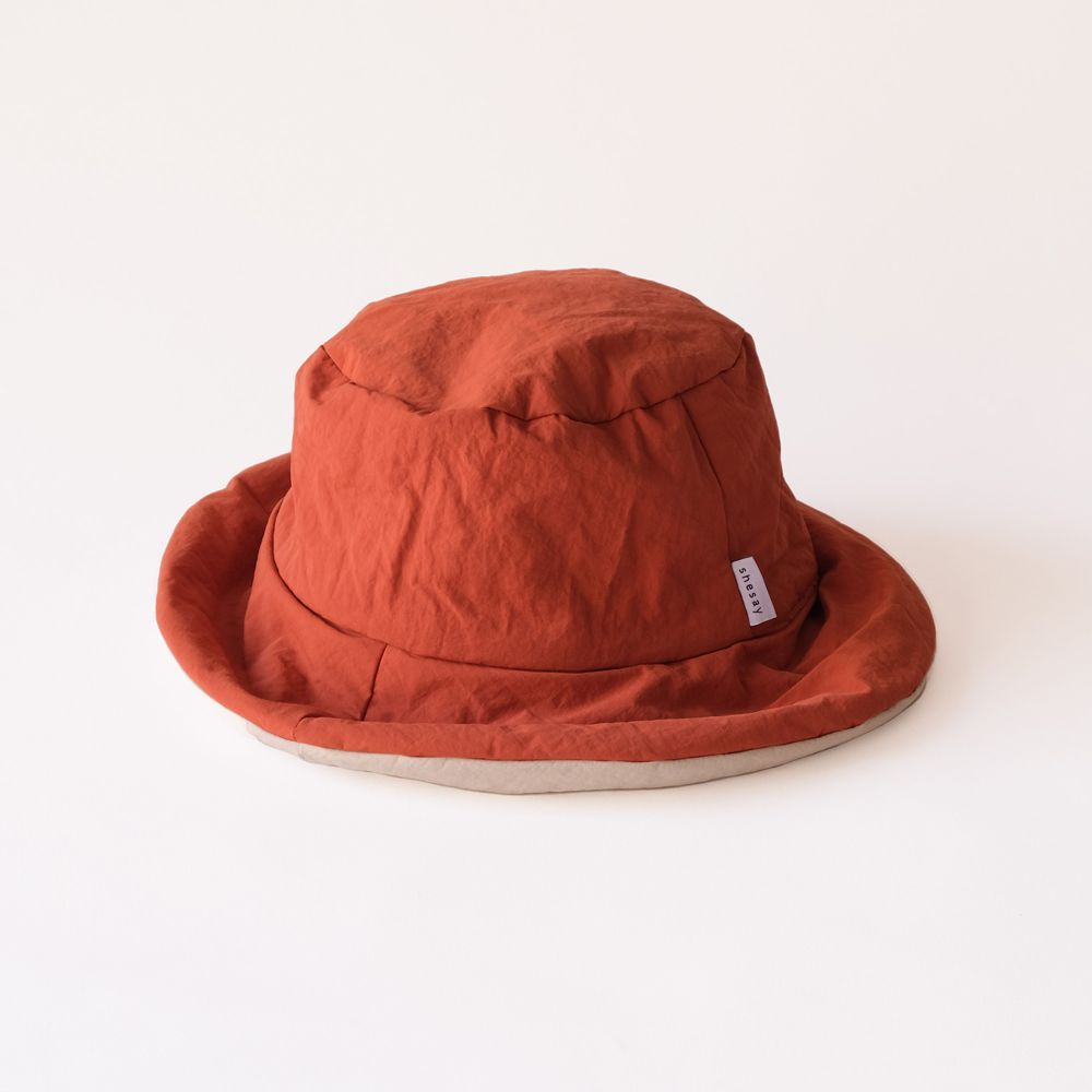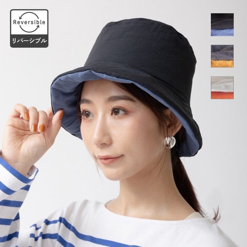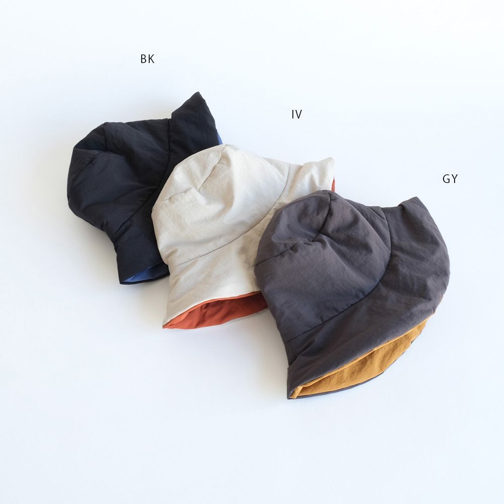 注目のバケットハットは、中綿を入れてバイカラーのリバーシブル仕立てにしています。その名の通り、バケツを逆さに返した台形のフォルムに短めのブリムがついたデザイン。メンズライクでカジュアルな印象もありますが、以外とフェミニンなワンピースやスカートとも相性がいいので、ワードローブに加えて損のないアイテム。軽くてシワも気にならないナイロン素材、深めにかぶれば小顔効果も抜群です。