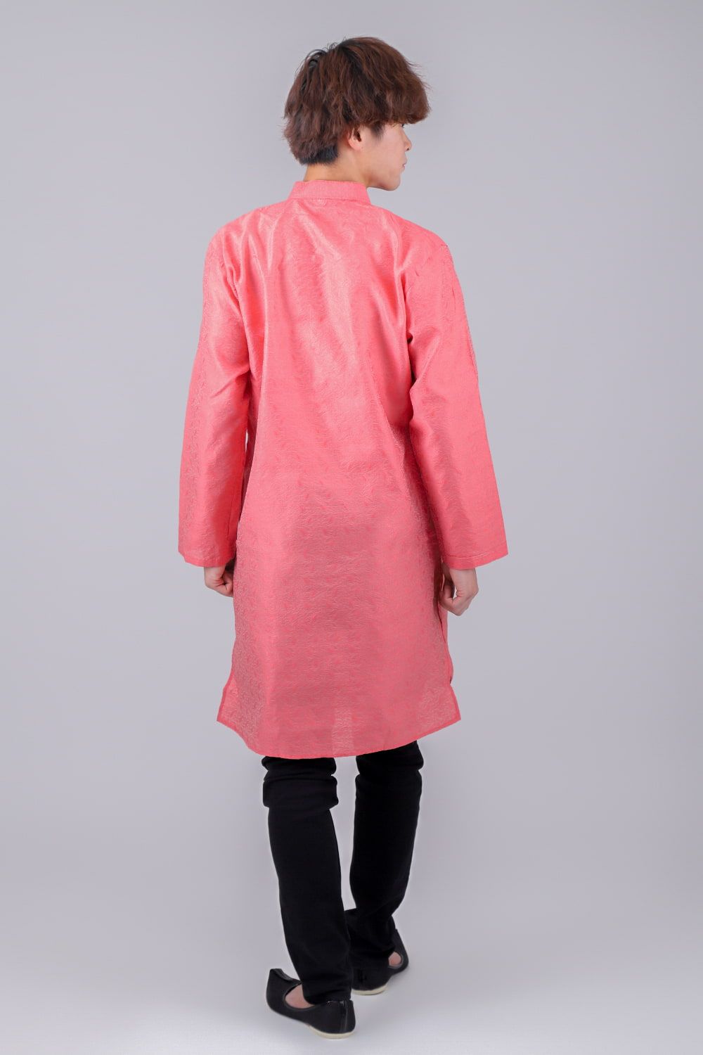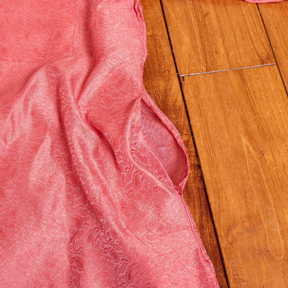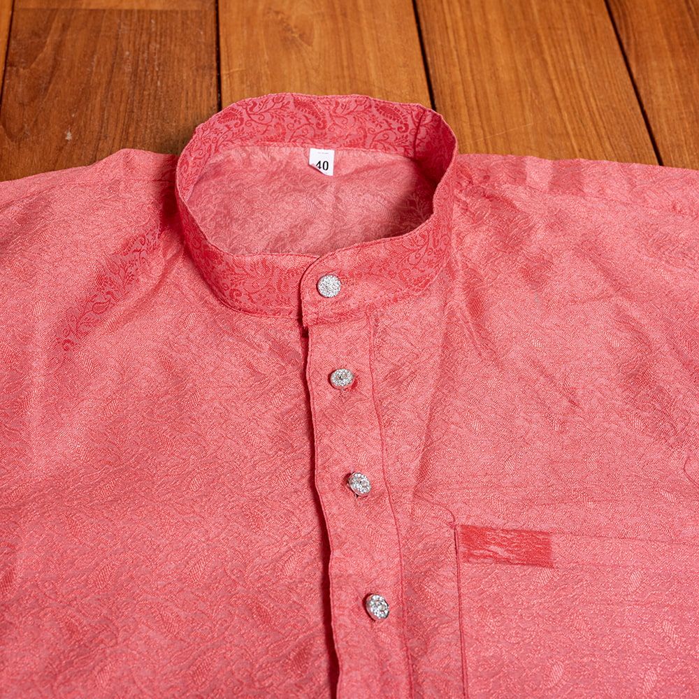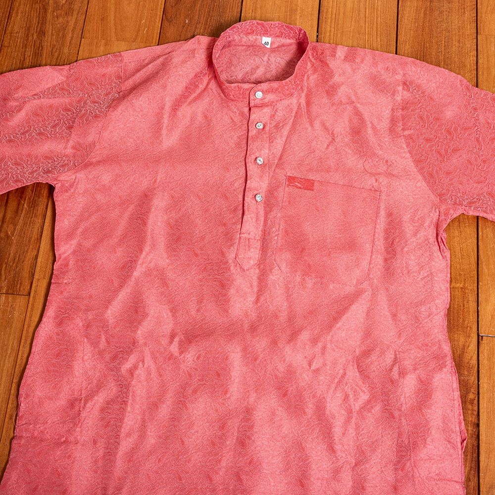 このクルタ・パジャマは、さりげない光沢感と更紗模様が魅力のクルタ・パジャマです。※パンツは付属いたしませんので、お手元のパンツを合わせて着用ください。モデルさんには、黒い細身のパンツを履いてもらいました。