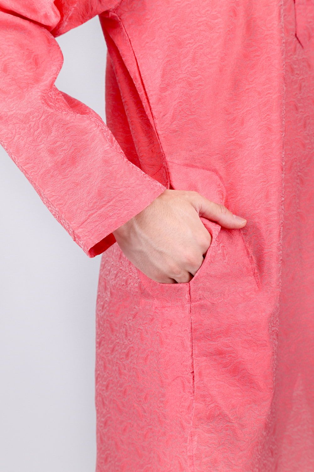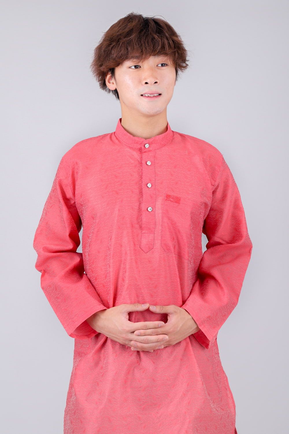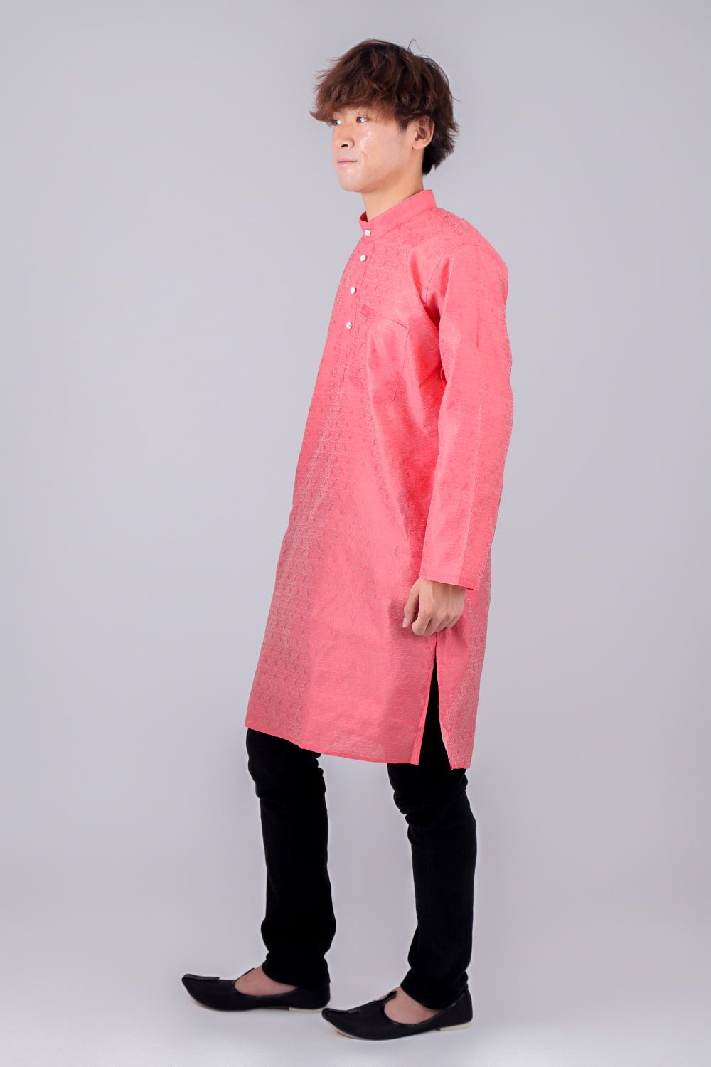 このクルタ・パジャマは、さりげない光沢感と更紗模様が魅力のクルタ・パジャマです。※パンツは付属いたしませんので、お手元のパンツを合わせて着用ください。モデルさんには、黒い細身のパンツを履いてもらいました。
