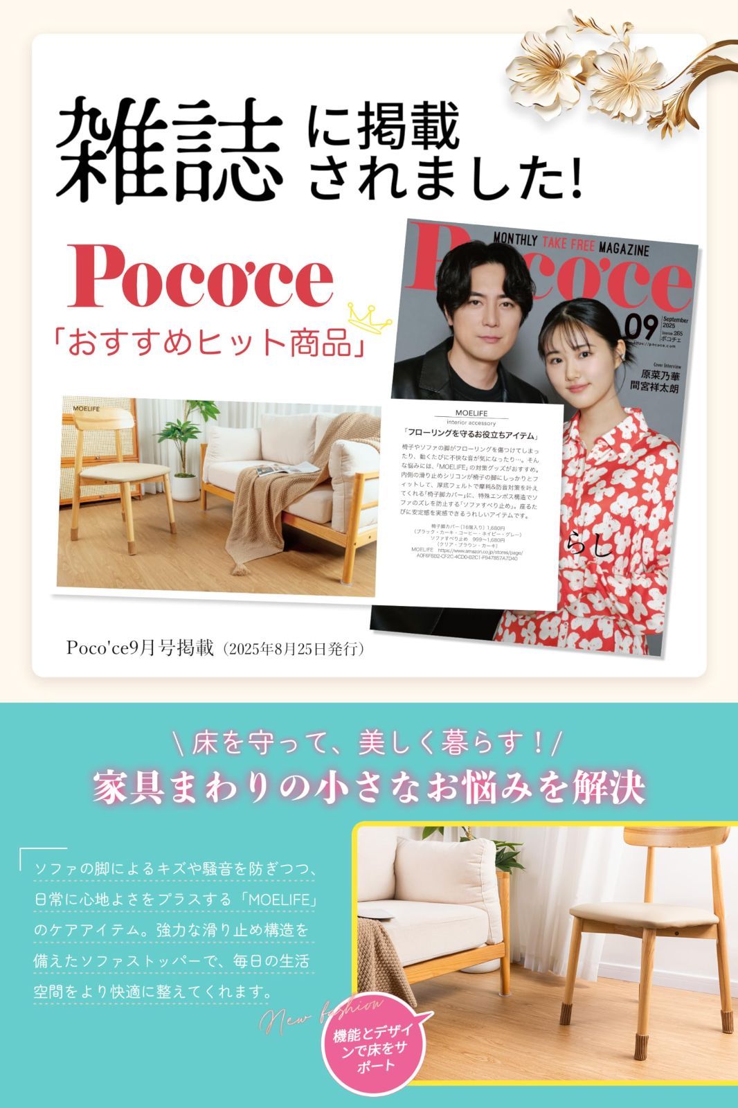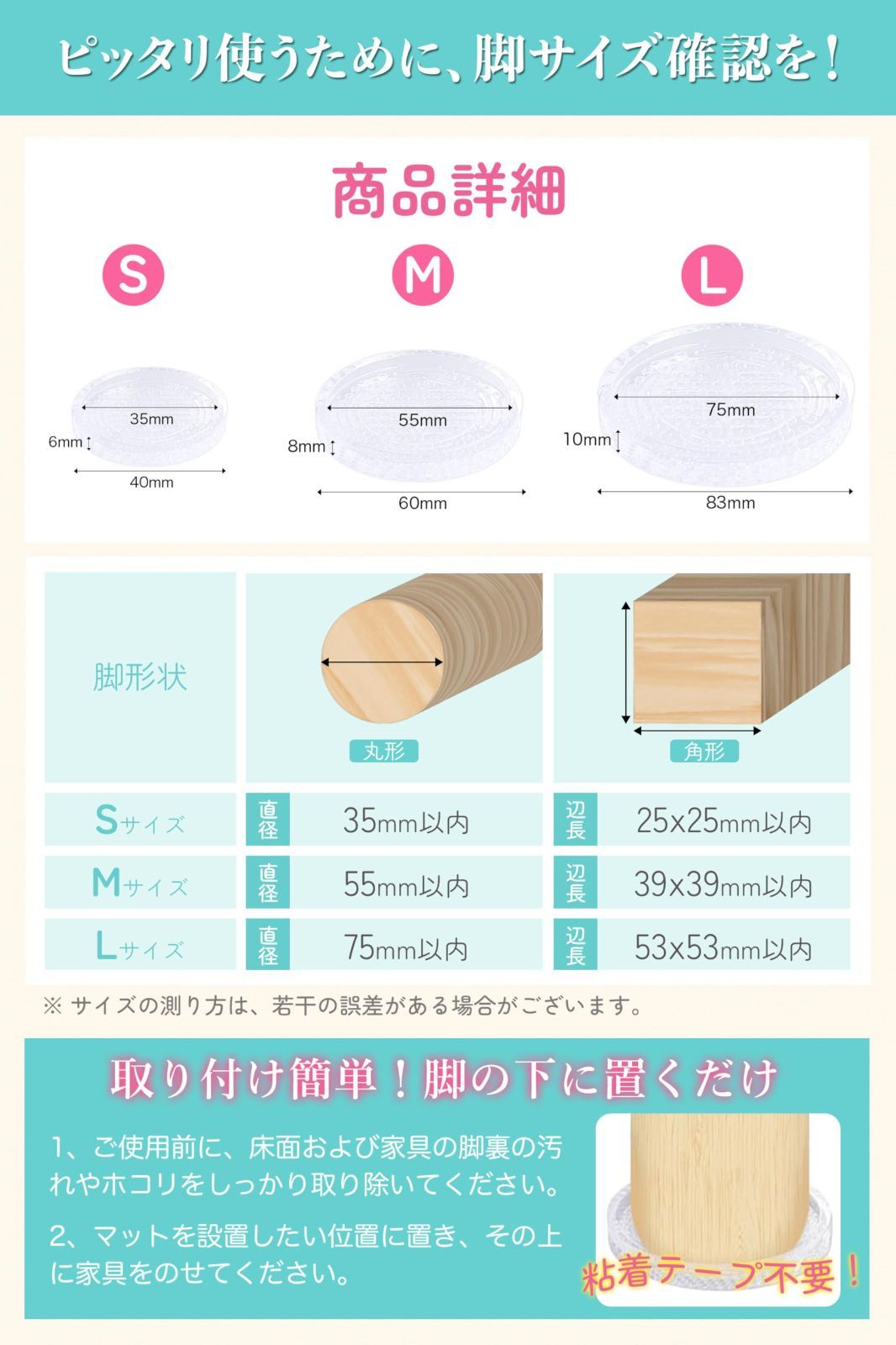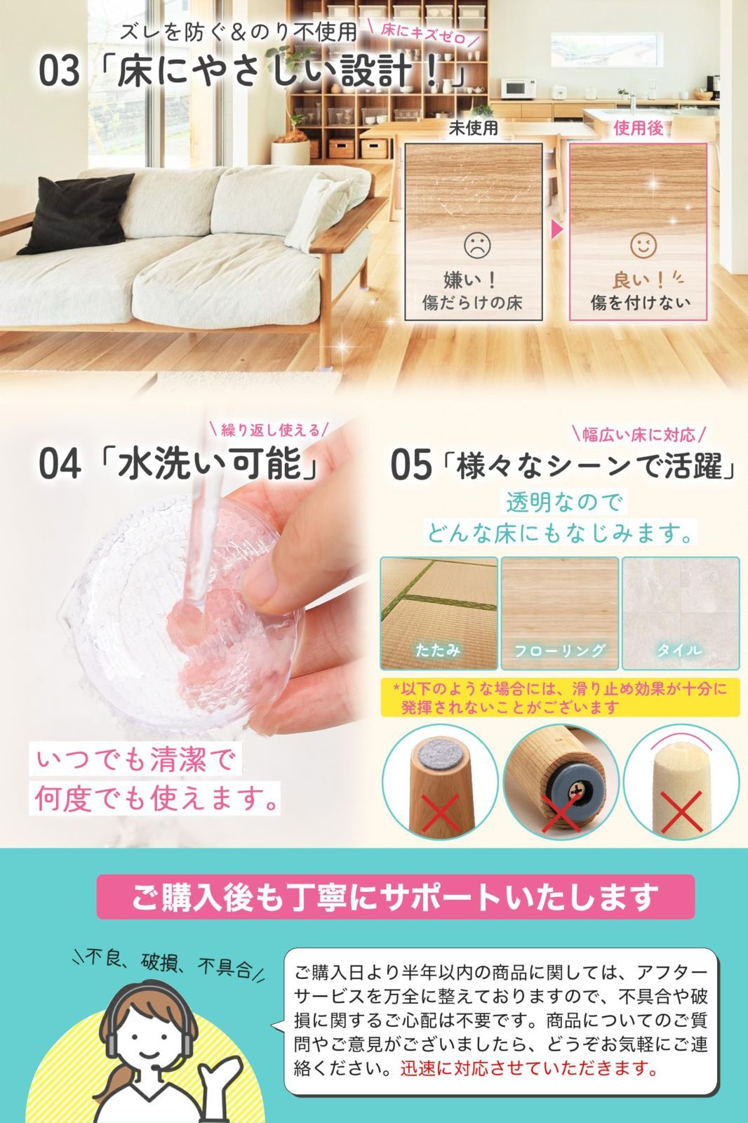 【傷&騒音対策に・賃貸でも使いやすい設計】家具の移動による床の傷や、ズレによる騒音を軽減します。脚の下に敷くだけで、床を保護し、騒音によるストレスもやわらぎます。のりを使わない仕様のため、賃貸マンションなどでも気軽に取り入れやすく、退去時の原状回復対策としても役立ちます