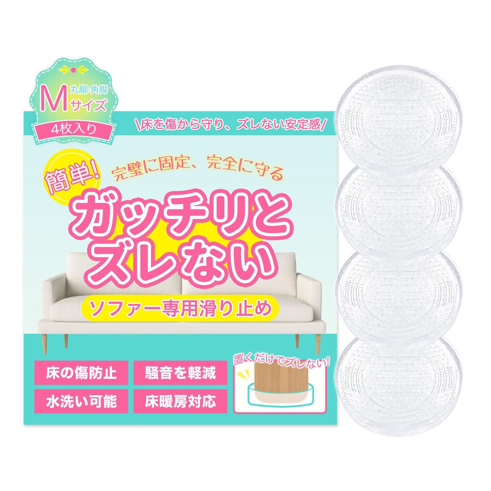 ソファ すべり止め 【Poco'ce掲載・全8種・ズレない・目立たず】 ソファー 滑り止め ソファ滑り止め 強力 ソファ 家具 テーブル ベッド 足 傷防止 すべり止めシート シリコンマット へこみ 騒音 ずれ 防止 床暖房 対応 高耐久素材 (クリア*4枚*丸型 M)