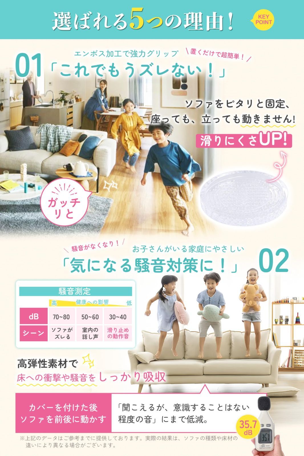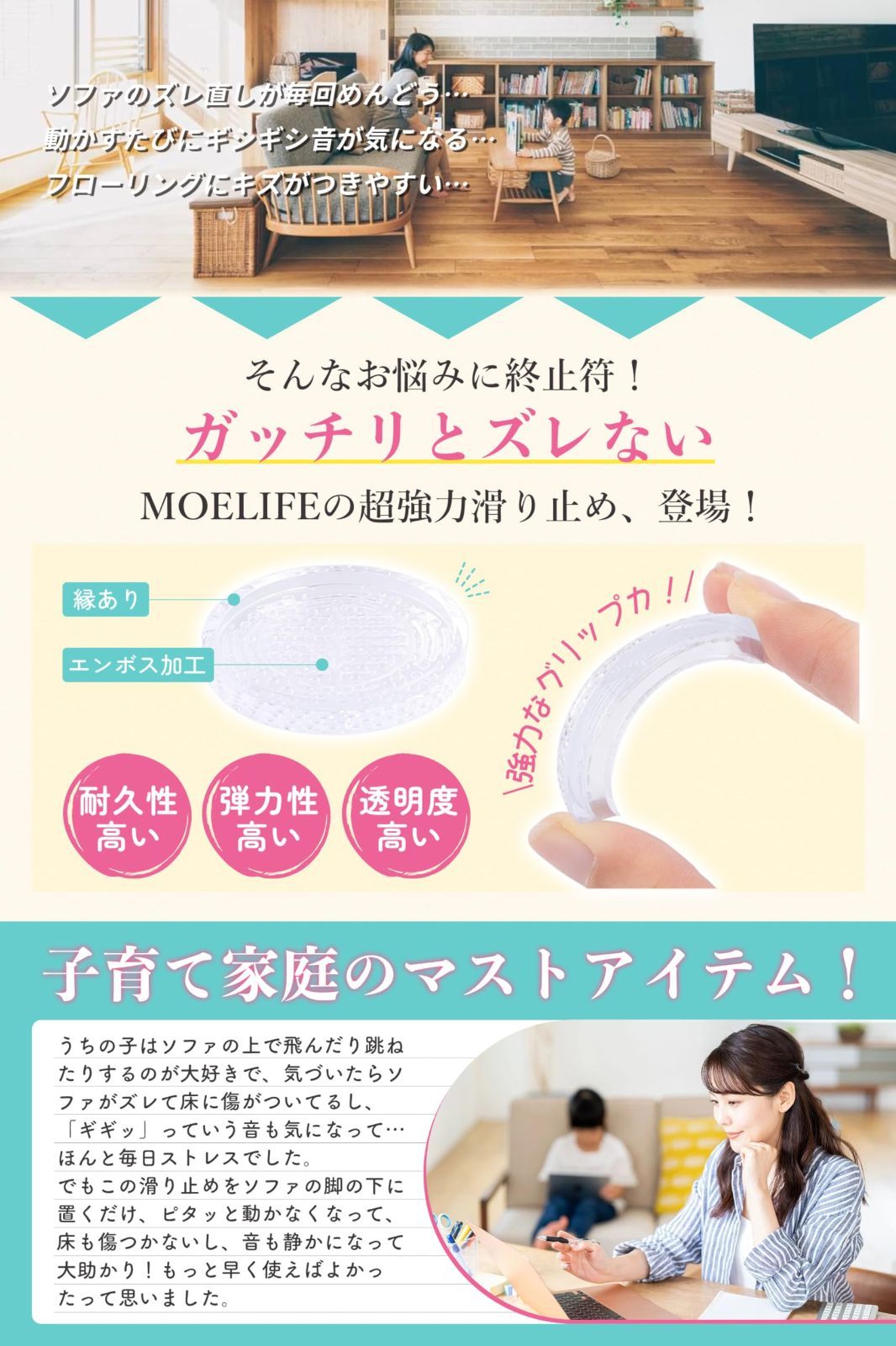 【スエンボス加工・ズレにくさを実感】裏面には特殊なエンボス加工が施されており、凹凸構造が床をしっかりとらえます。座るたびにズレにくく、安定した座り心地を実感できます。1枚あたり約200kgの耐荷重で、圧力を効果的に分散します。ソファはもちろん、他の家具にもご使用いただけます。※開封直後に素材特有のにおいを感じる場合がありますが、人体には無害で、ご使用とともに徐々に薄れてまいります