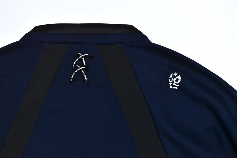 脇から袖下に配置したブランドロゴをポイントにラウンド時に必要な機能的なカットラインを構成。