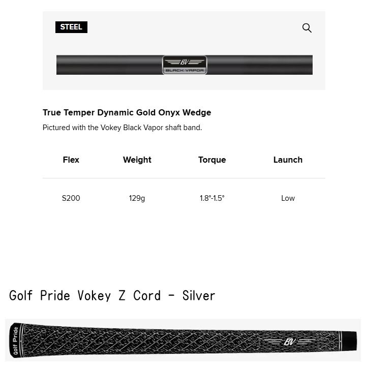 チタニウム カーバイド ベイパー仕上げのヘッドに、特別仕様のシャフト(Dynamic Gold Wedge - Onyx)とグリップ(Golf Pride Vokey Z Cord - SIlver)を組み合わせ、洗練された一体感のあるルックスに仕上げました。