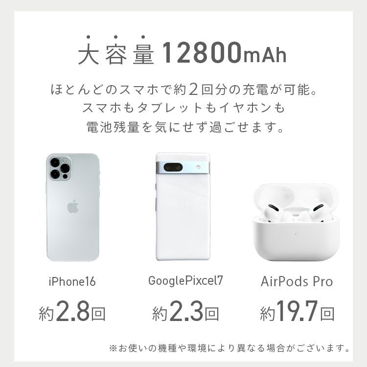 たっぷり大容量12800mAhのモバイルバッテリーです。