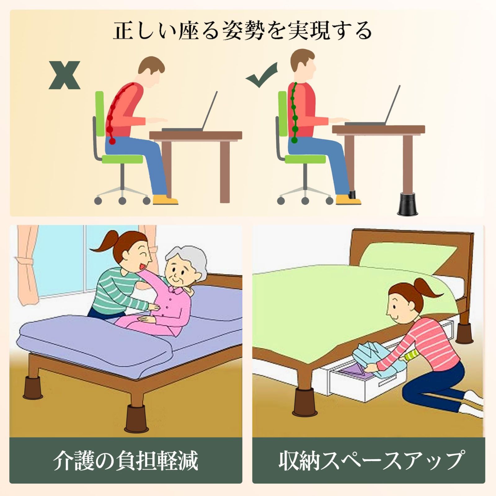 【使用効果】家具の脚を簡単に高くすることではなく、スペースをプラスし、掃除もらくになり、高齢者にとって助けナシでベッドから出れます。収納力アップももちろんアップします。