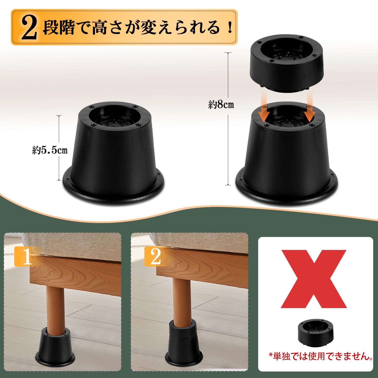 継ぎ脚 高さ調整脚 継足 2段階調整可能 延長脚 アジャスター ベッド テーブル ソファ 机 こたつ 高さを上げる足 テーブル脚台 多段階 高さ調節脚 暖房器具 家具 脚台 つぎあし 底上げ 2Way 5.5cm 8cm 丸型 ブラック