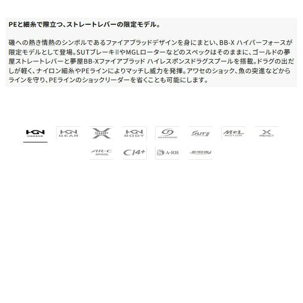 磯への熱き情熱のシンボルであるファイアブラッドデザインを身にまとい、BB-X ハイパーフォースが限定モデルとして登場。SUTブレーキ2やMGLローターなどのスペックはそのままに、ゴールドの夢屋ストレートレバーと夢屋BB-Xファイアブラッド ハイレスポンスドラグスプールを搭載。ドラグの出だしが軽く、ナイロン細糸やPEラインによりマッチし威力を発揮。アワセのショック、魚の突進などからラインを守り、PEラインのショックリーダーを省くことも可能にします。