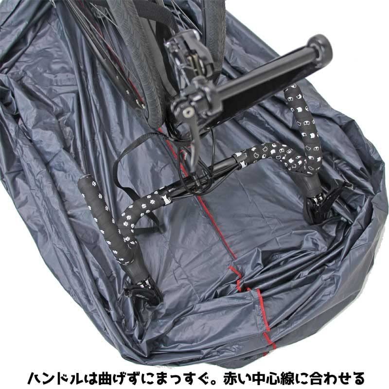 縦型輪行袋よりも持ち運びサイズと電車内での設置スペースがかさ張りますが、ハンドルとフォークを下にして縦置きができます。