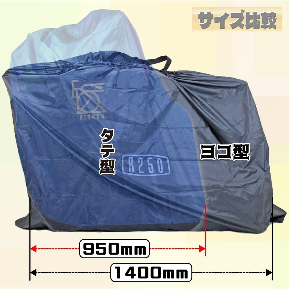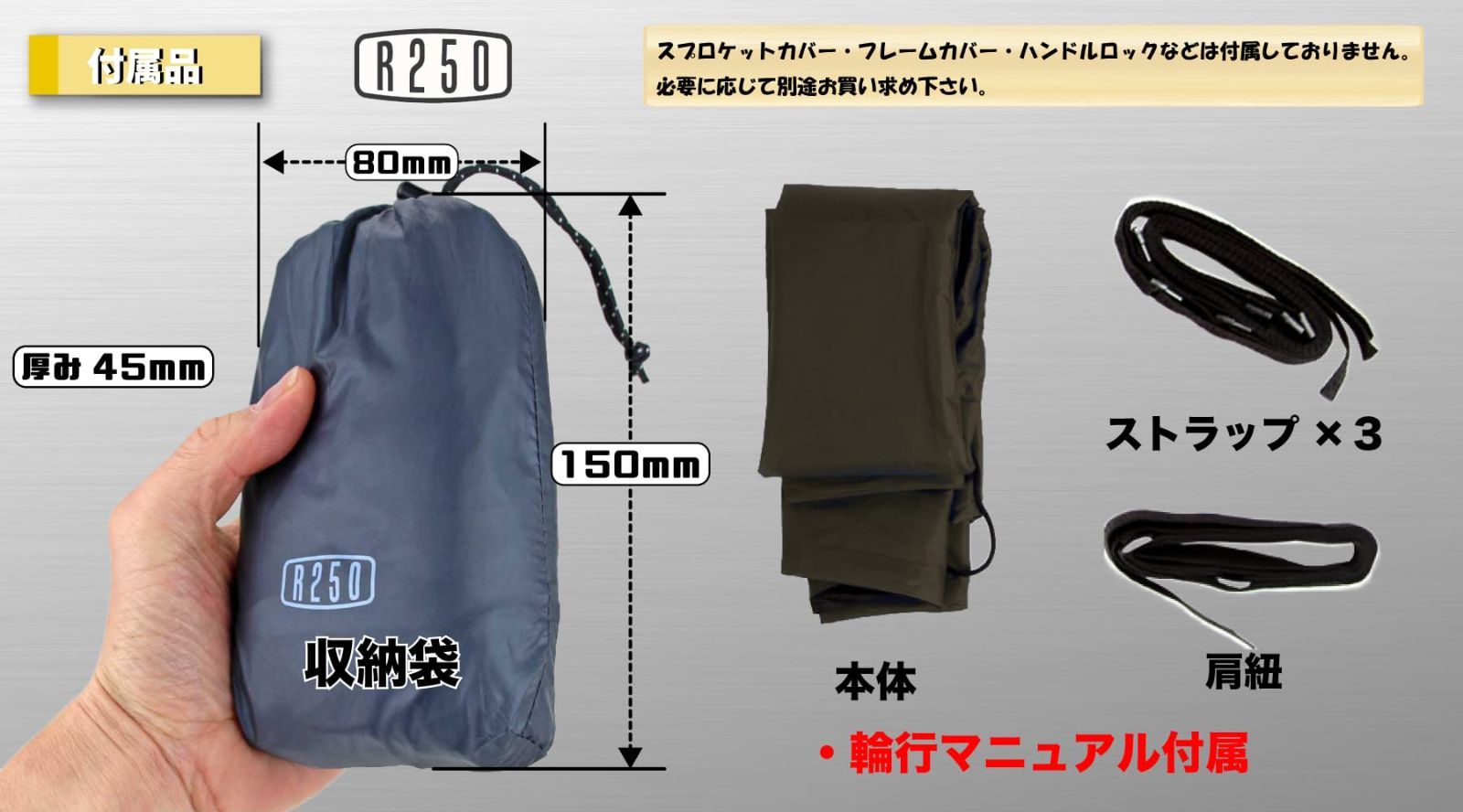 R250では初めての、横型輪行袋。バイクをさかさまにして、サドルとハンドルで自立します。