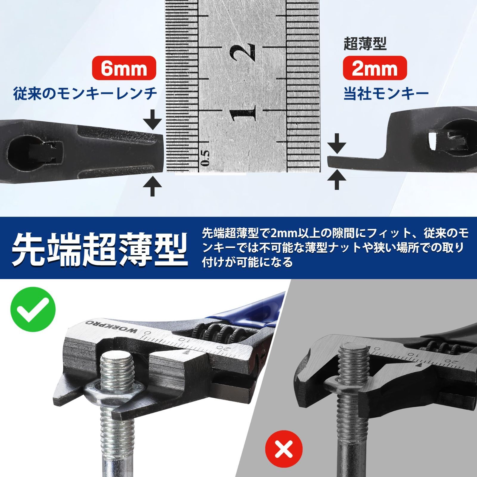 【超薄型先端 薄型ナットに最適】超薄型先端で、2mmの隙間にもぴったりフィット。従来のモンキーレンチでは困難な薄型ナットの取り付けも楽々対応。