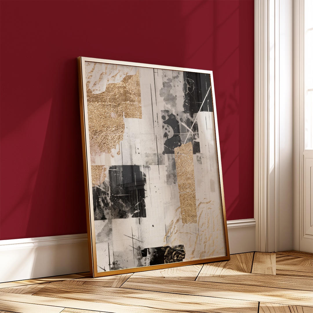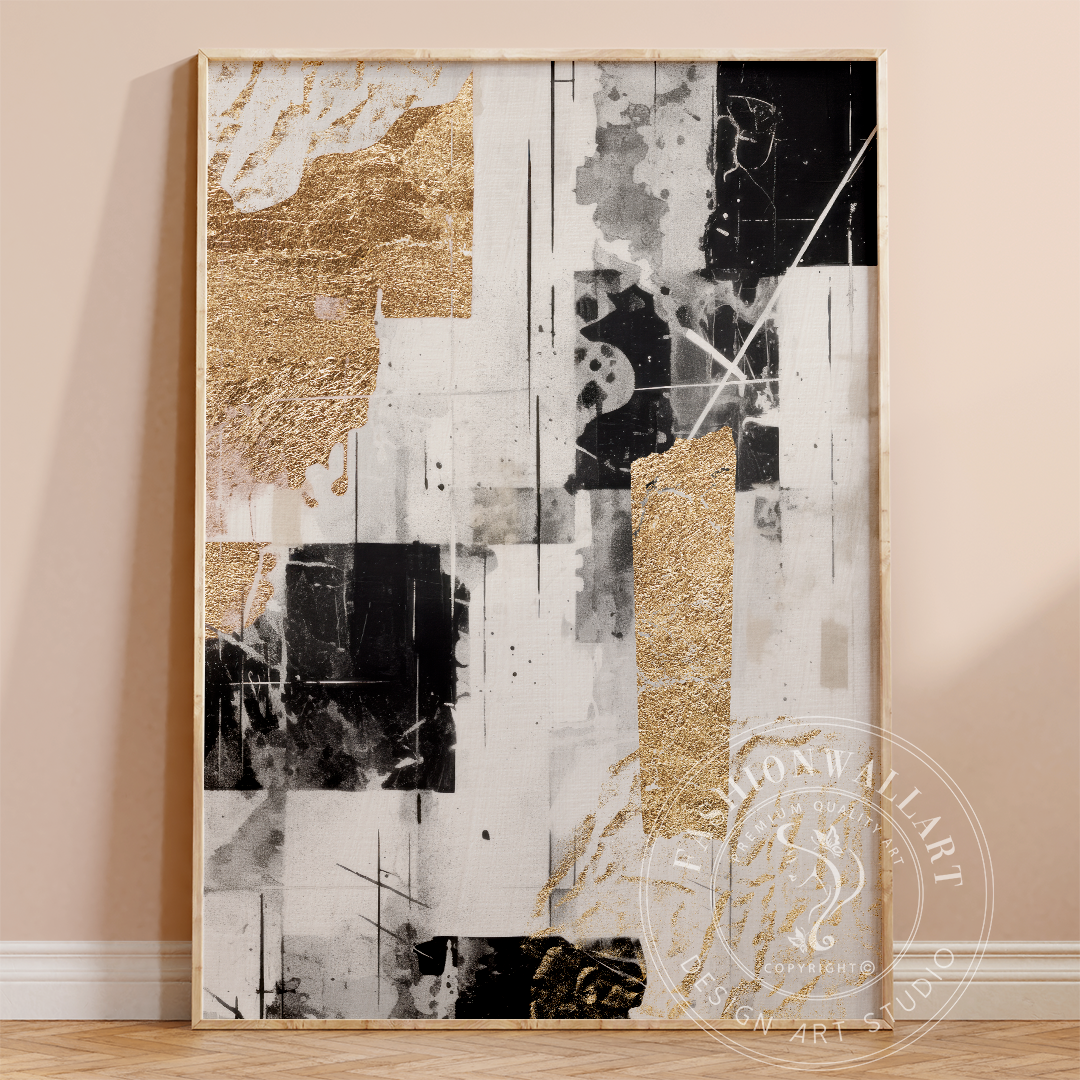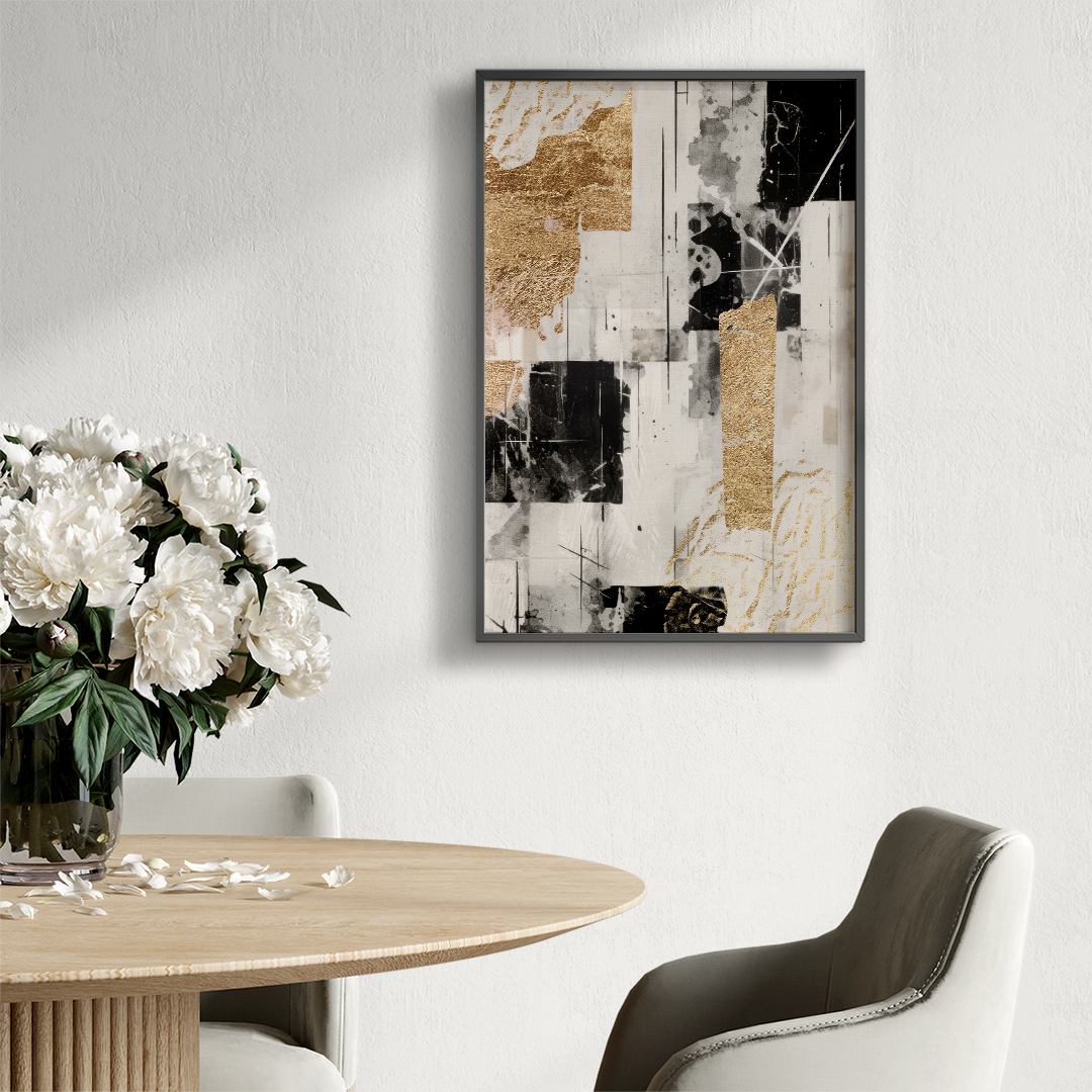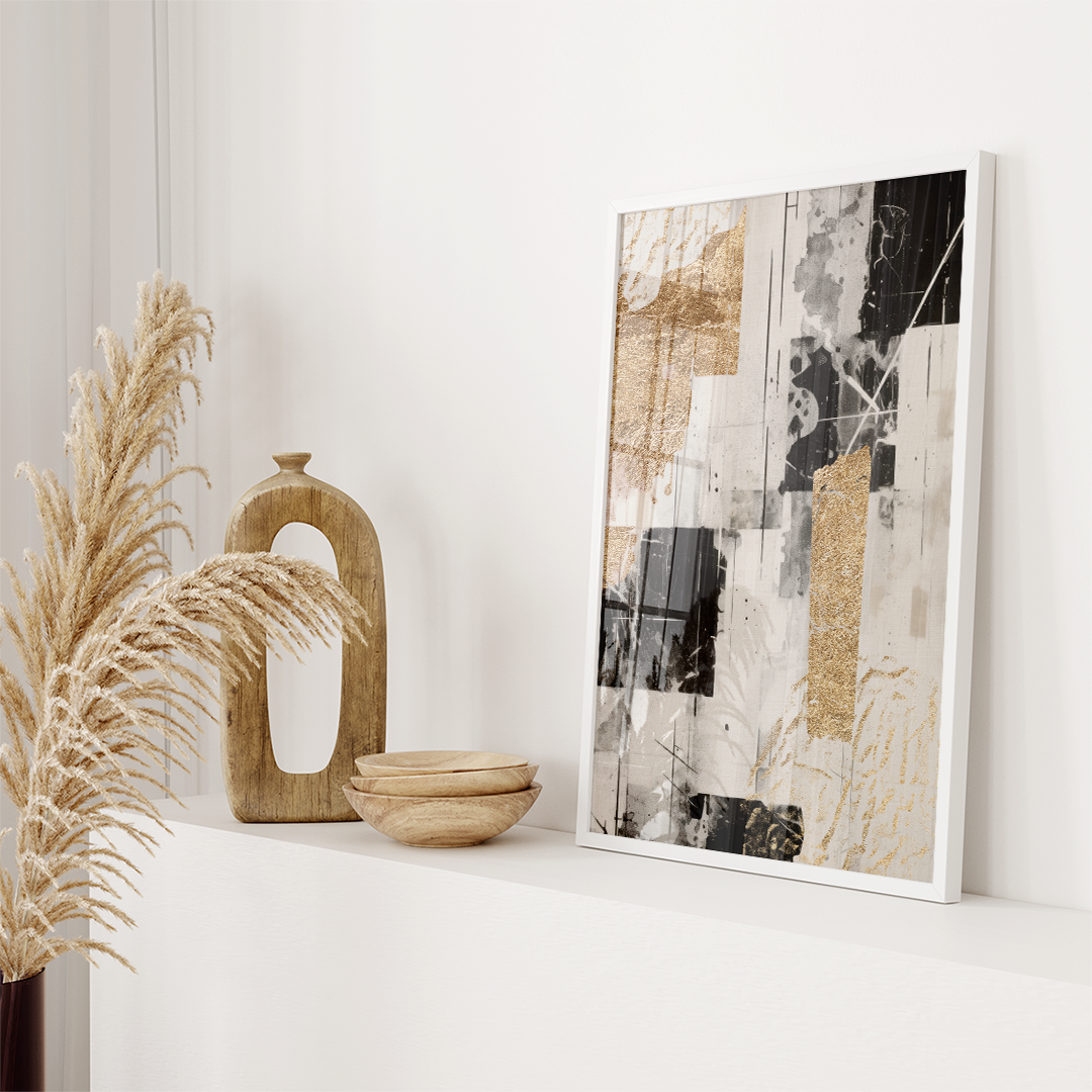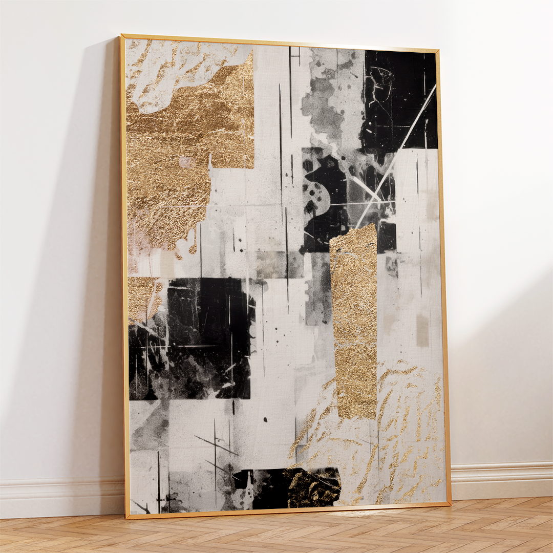 ブラックとホワイトのモノトーンにゴールドを組み合わせた抽象アートポスターです。異なる質感と色彩が調和し、空間にモダンかつ高級感のある雰囲気をもたらします。リビングや寝室、オフィスなど、洗練されたインテリアを求める方におすすめ。おしゃれな空間づくりにぴったりです。
