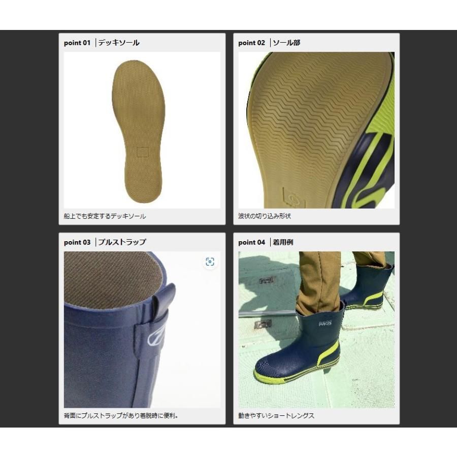 ●滑りやすい船上に対応するデッキソールのフィッシングブーツ。後方のプルストラップとショートレングスで着脱が容易。
