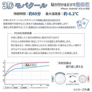 スマートフォンやタブレットなどに貼るだけで、デバイスの温度上昇を緩和する半立体ステッカーです。中身には、熱を吸収・放出する効果のあるPCM素材を使用しており、28度以上の熱を吸収・放出します。最大約ー6.2度の熱を吸収する効果があり、動作の遅さやバッテリーの劣化を緩和します。