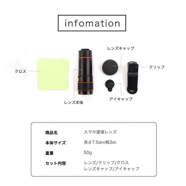 この商品はスマートフォン用の望遠レンズです。レンズ部分にワンタッチで取り付けができ、MAX8倍の撮影ができます。