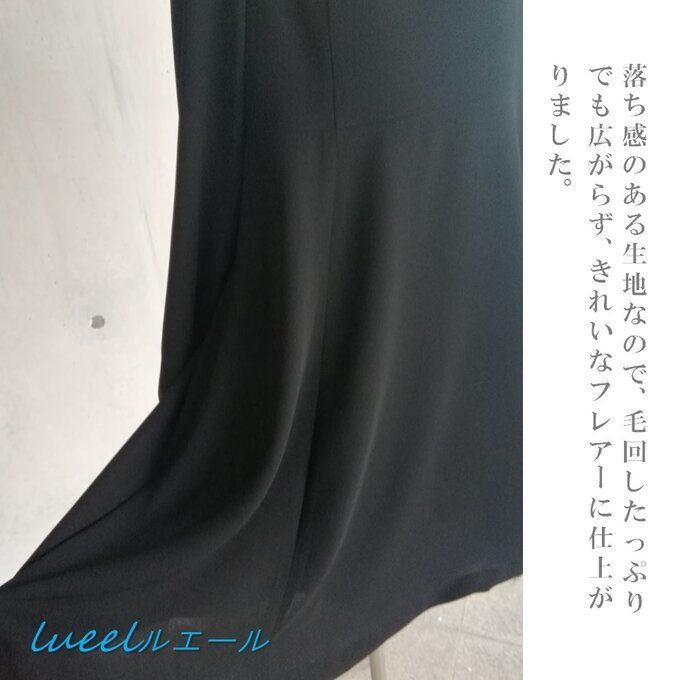 身頃は少し、体に合わせたIライン、裾にかけてフレアーを出したスカート部分はお腹周りが気にならず、楽で足長効果があります。