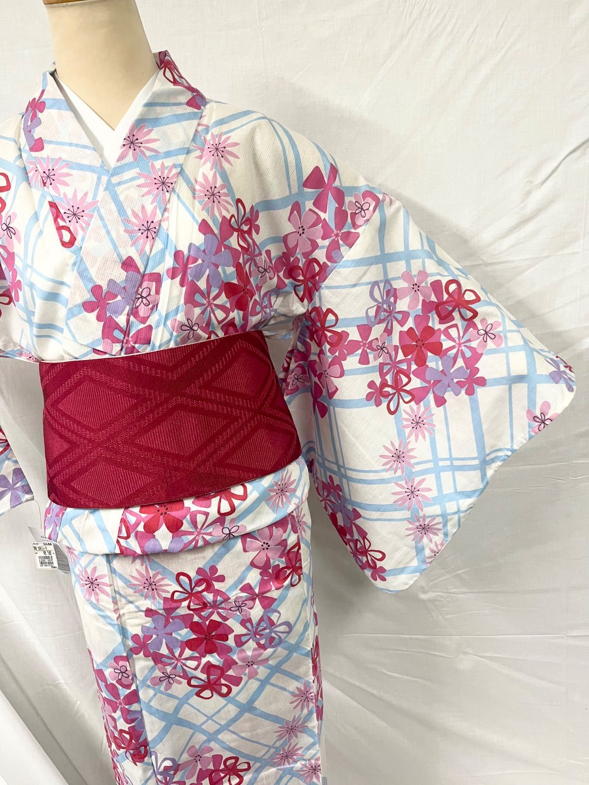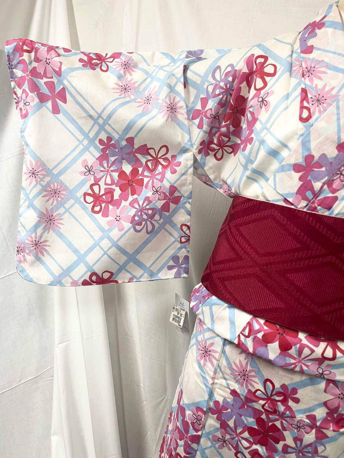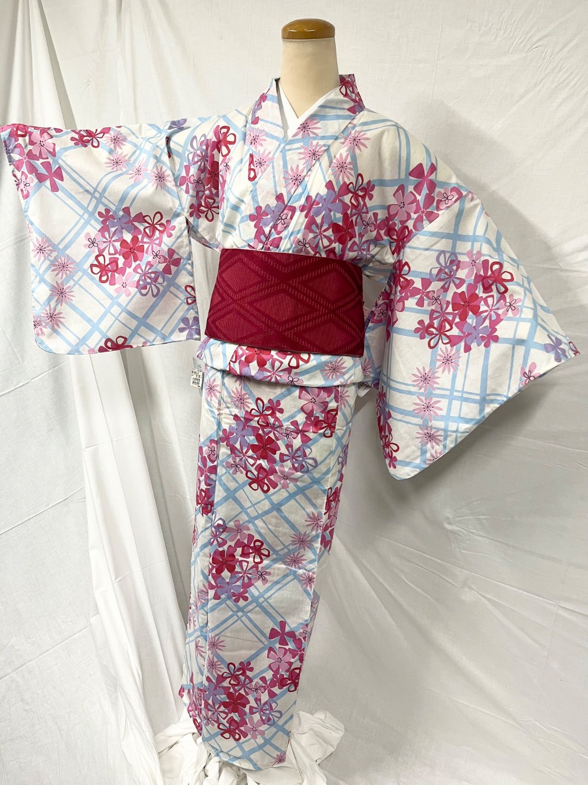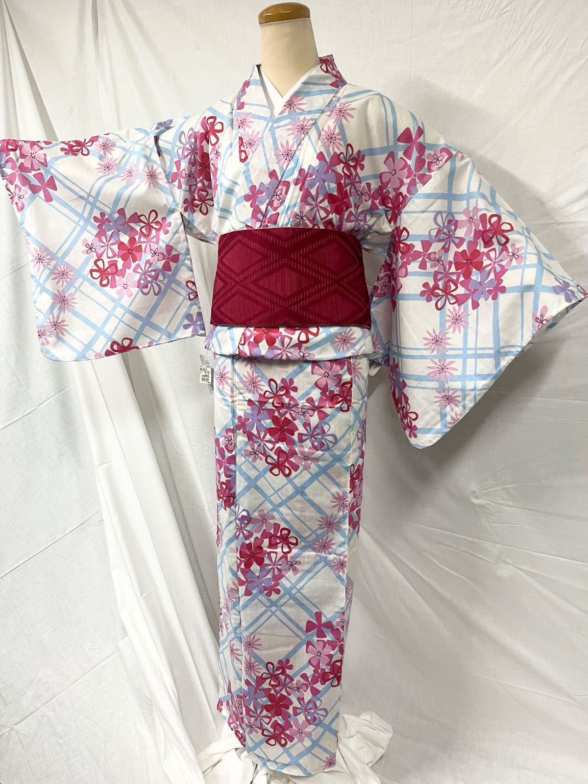 白地に水色の格子柄とピンクの花柄模様がアクセントの浴衣です。