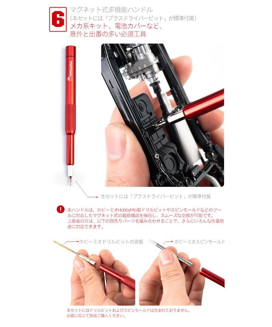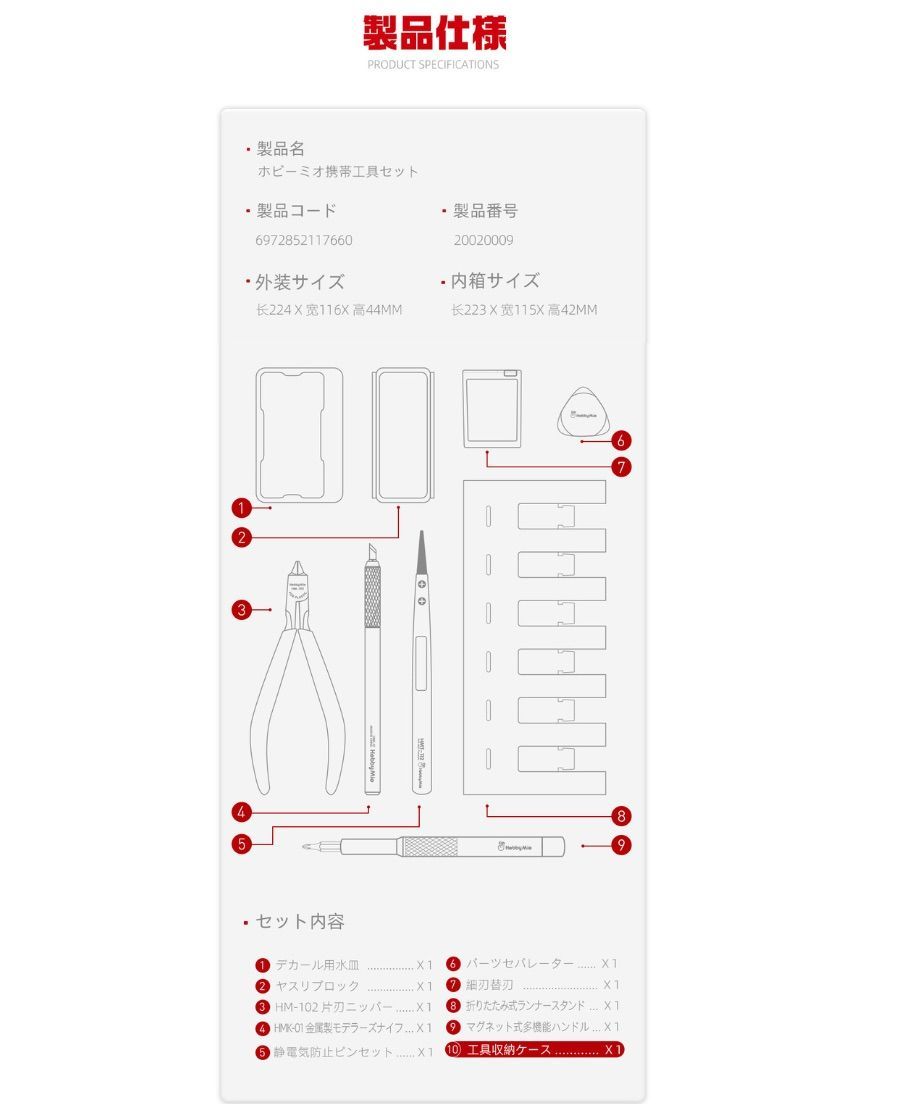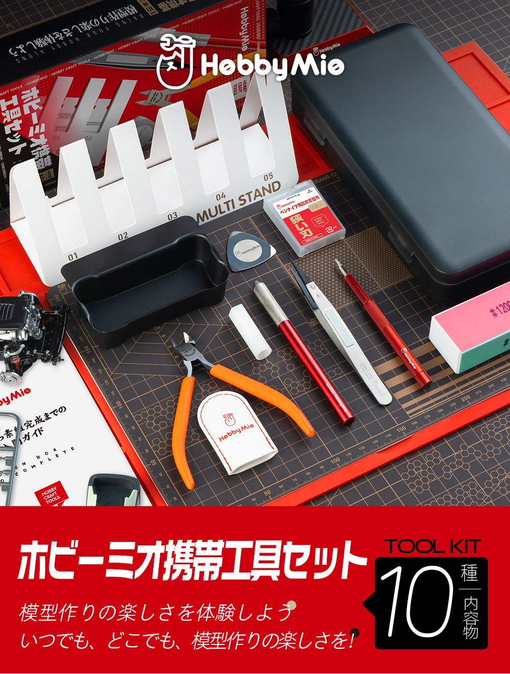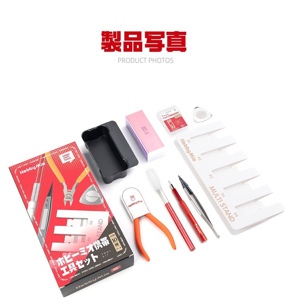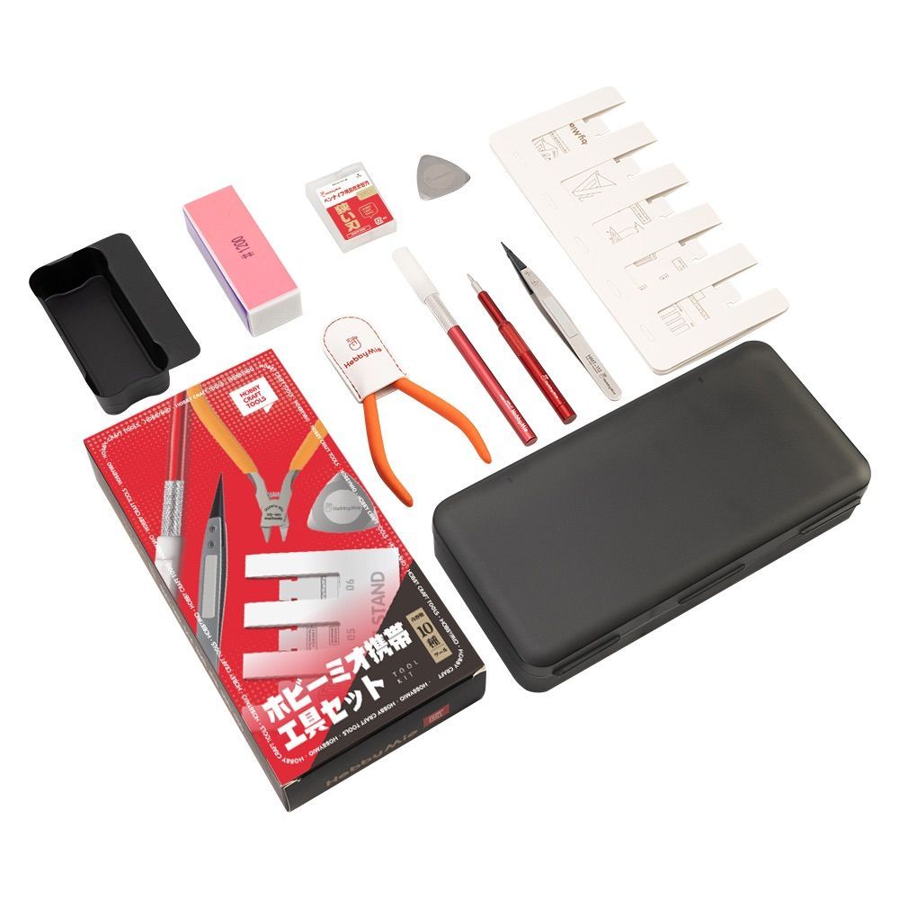 「ホビーミオ 携帯工具セット」は、模型製作に必要な9種類のツールを一つにまとめた高品質スターターキットです。