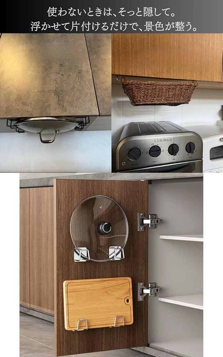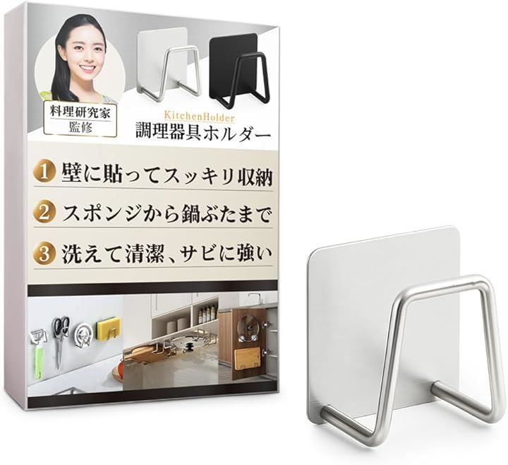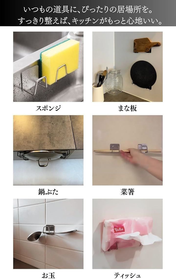 「ひとつで多用途、キッチンがもっと便利に」本製品は、スポンジやおたま、菜箸、まな板、鍋ぶた、ティッシュケースなど、さまざまなキッチン小物に対応可能。