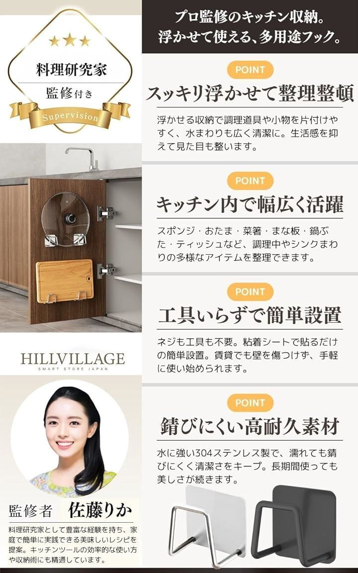 「浮かせて整う、スマート収納」キッチンで散らかりがちなスポンジや調理道具を「浮かせて収納」することで、シンクまわりを常にすっきり清潔に保つことができます。
