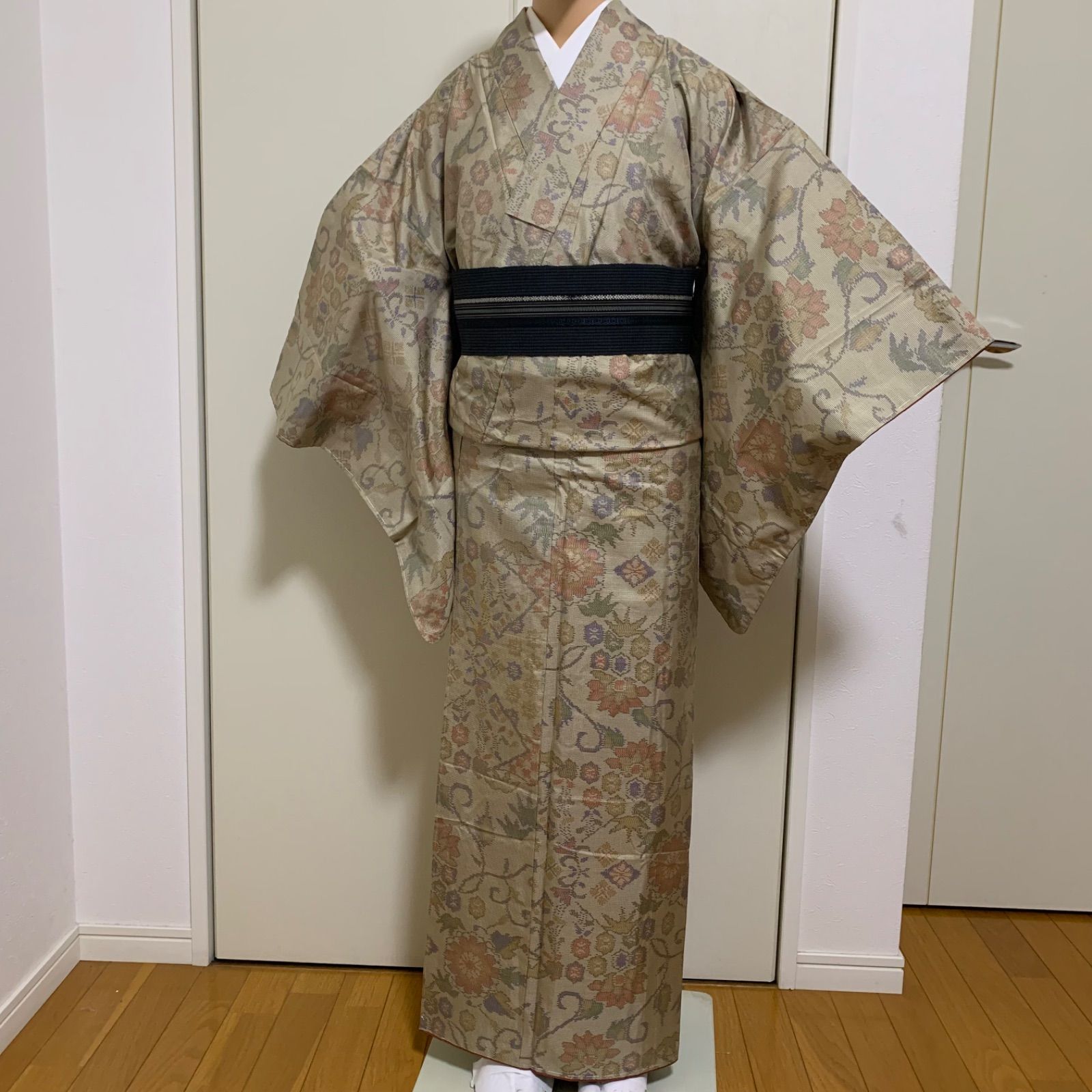 着物 紬 袷 裄64.5センチ ベージュ レディース 一部しつけ糸付き