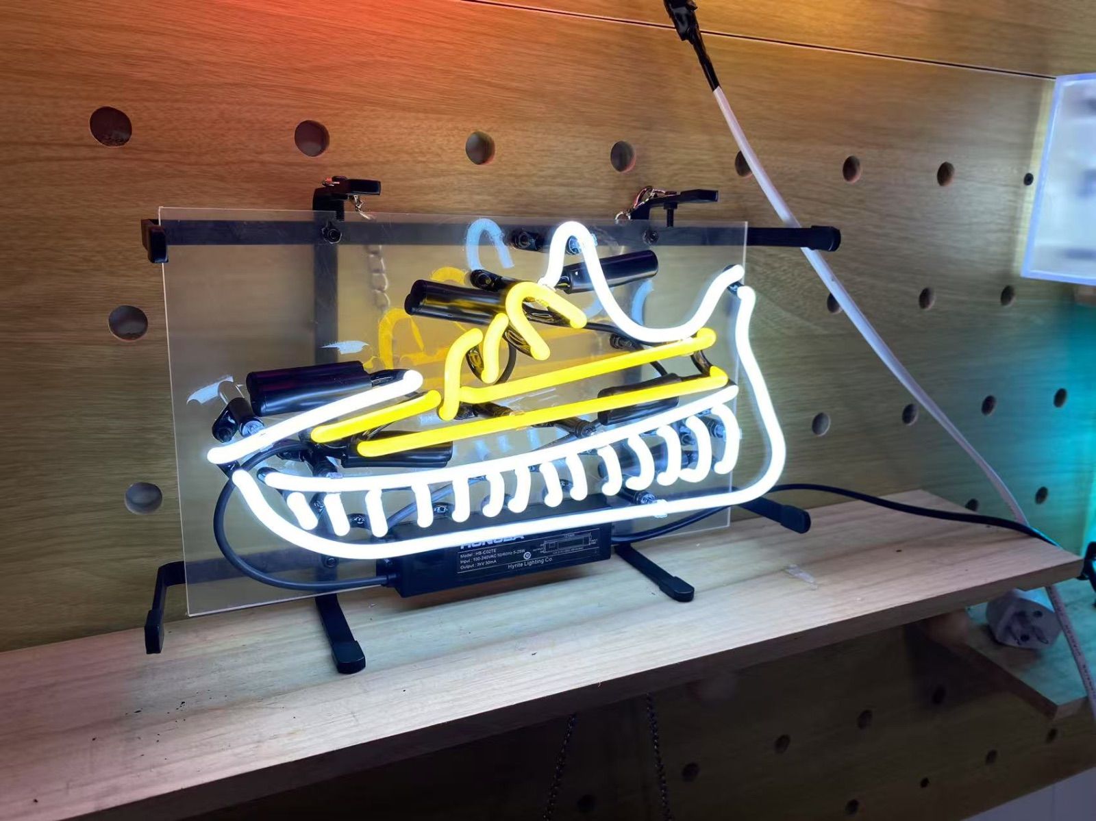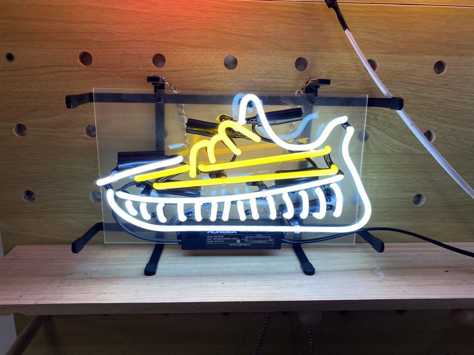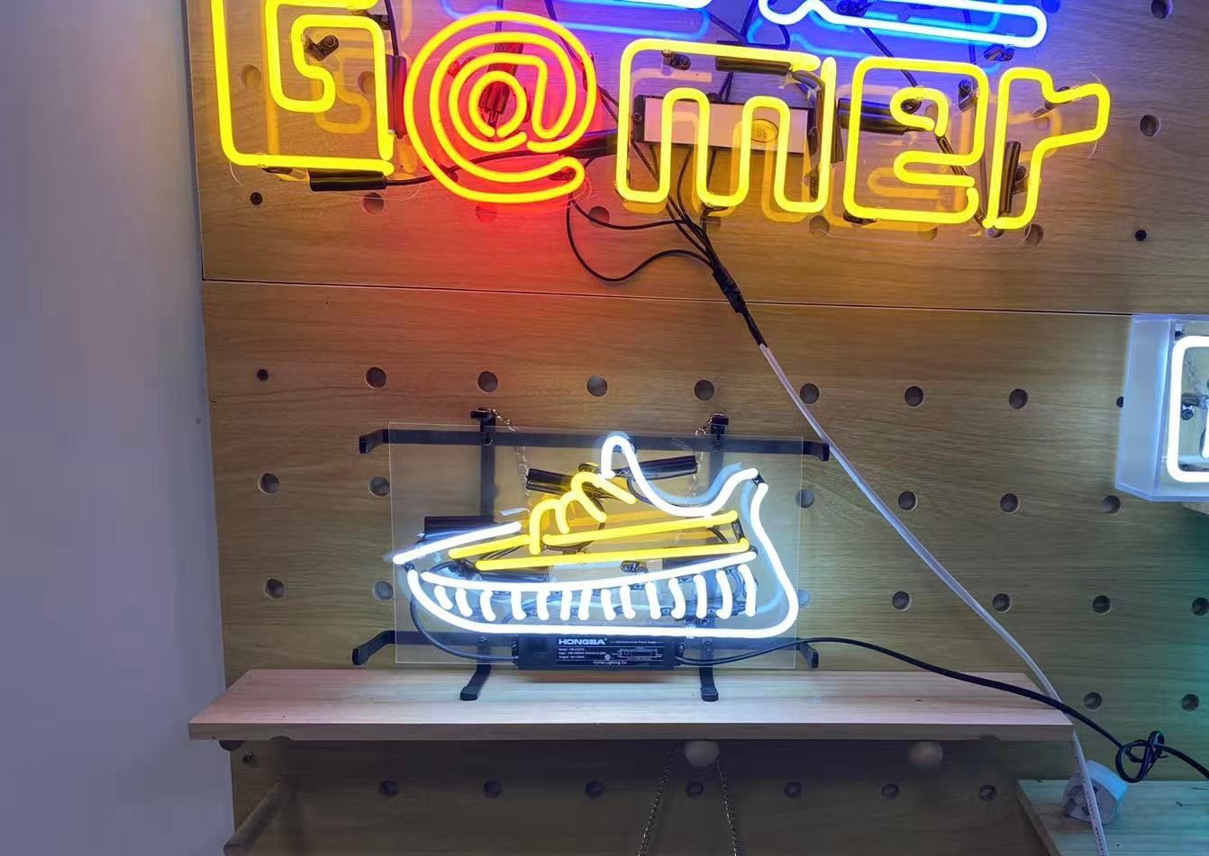 ・デザイン:スニーカー型のユニークなデザインが特徴のネオンアート。白と黄色の光が組み合わさり、遊び心とスタイリッシュさを演出。スニーカーファンやカジュアル空間にぴったりのインテリアライトです。