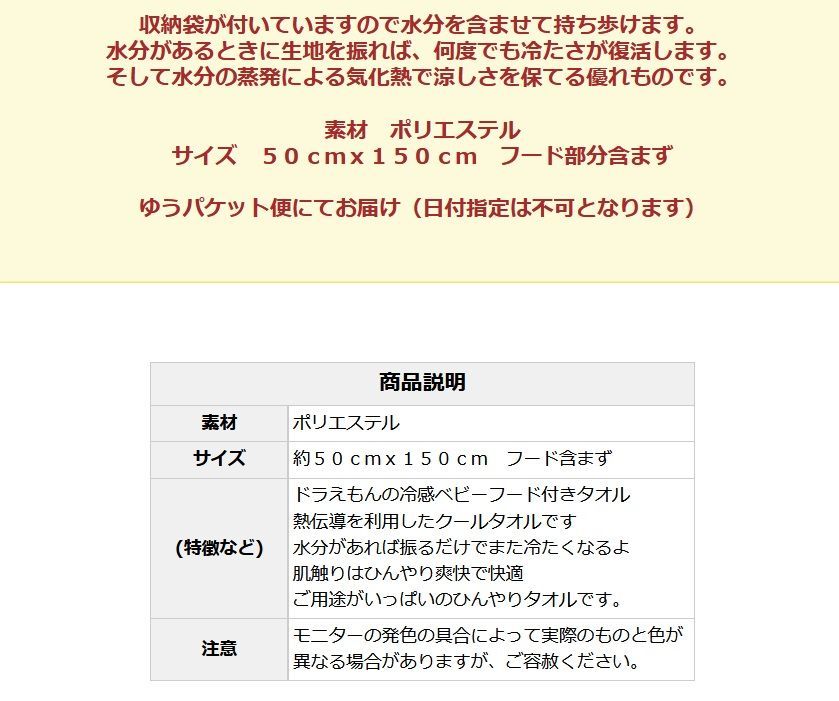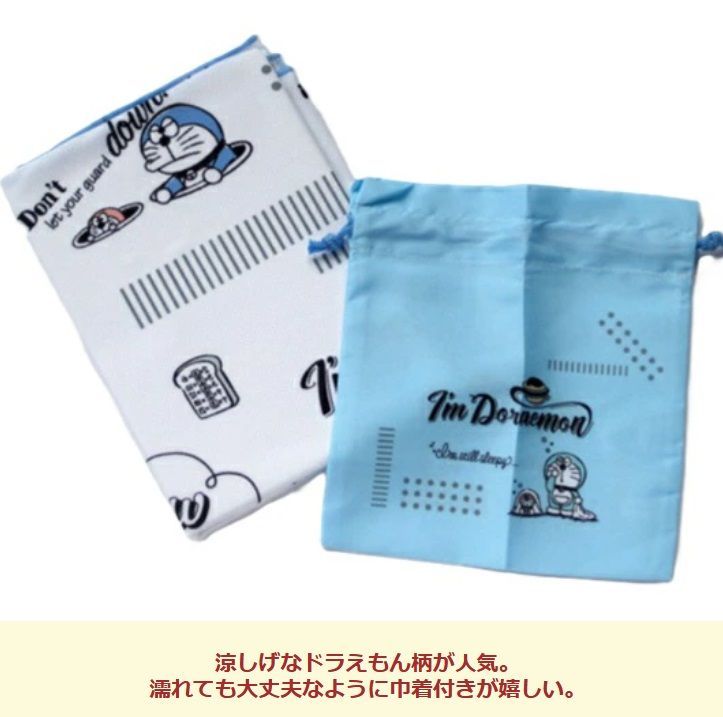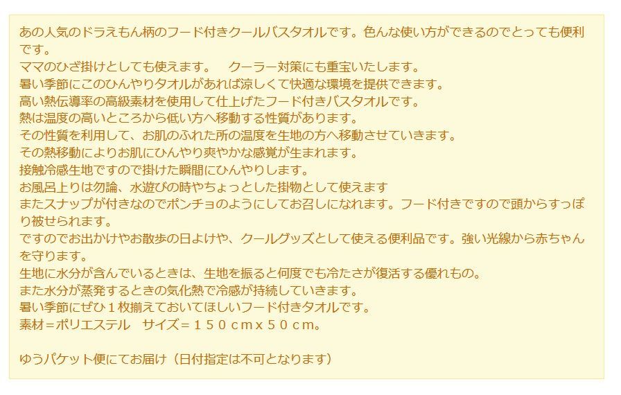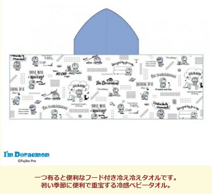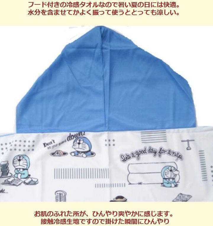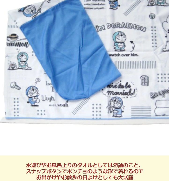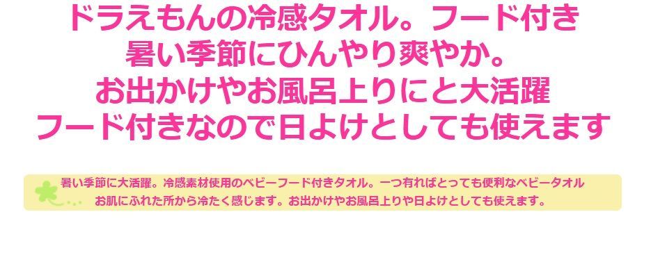 あの人気のドラえもん柄のフード付きクールバスタオルです。色んな使い方ができるのでとっても便利です。