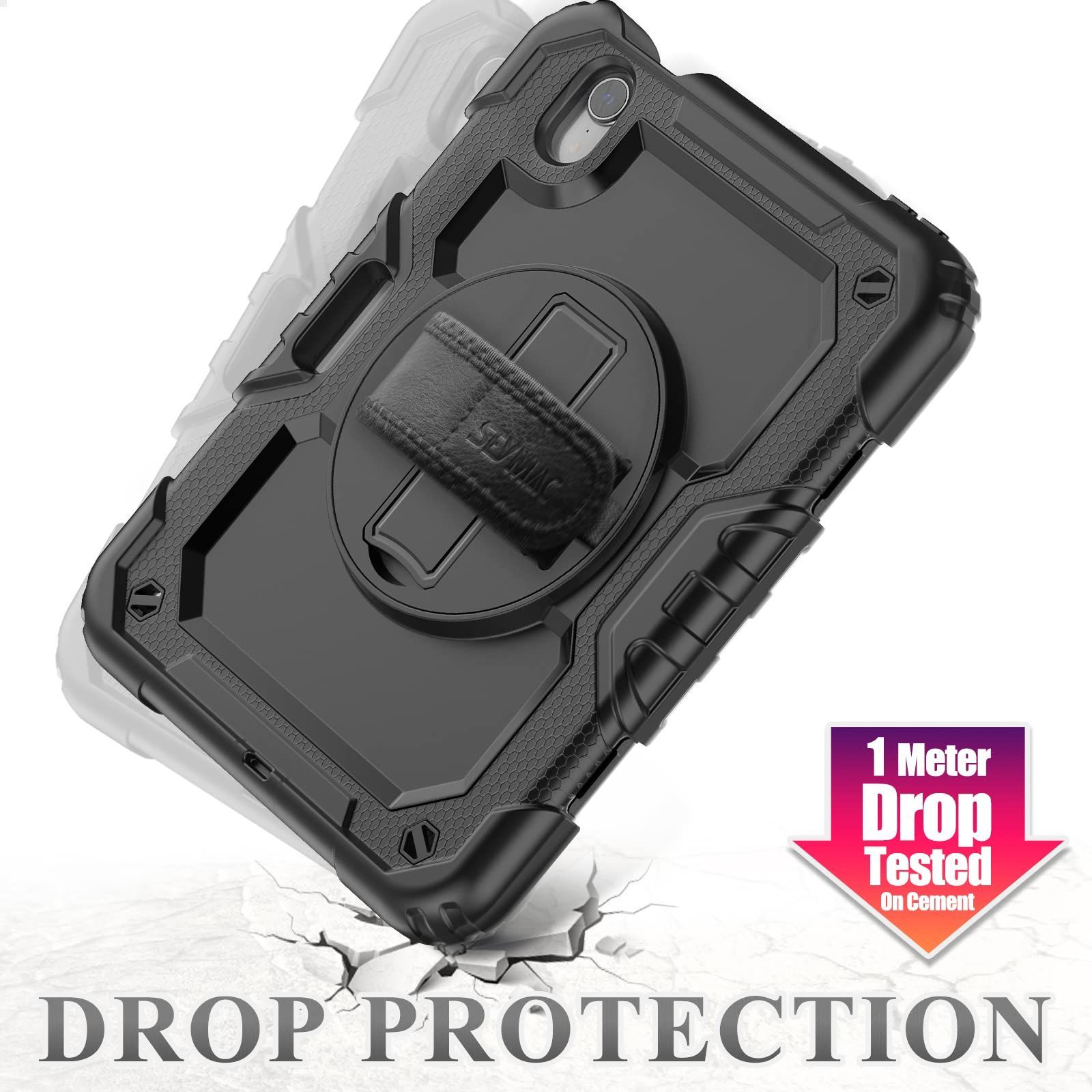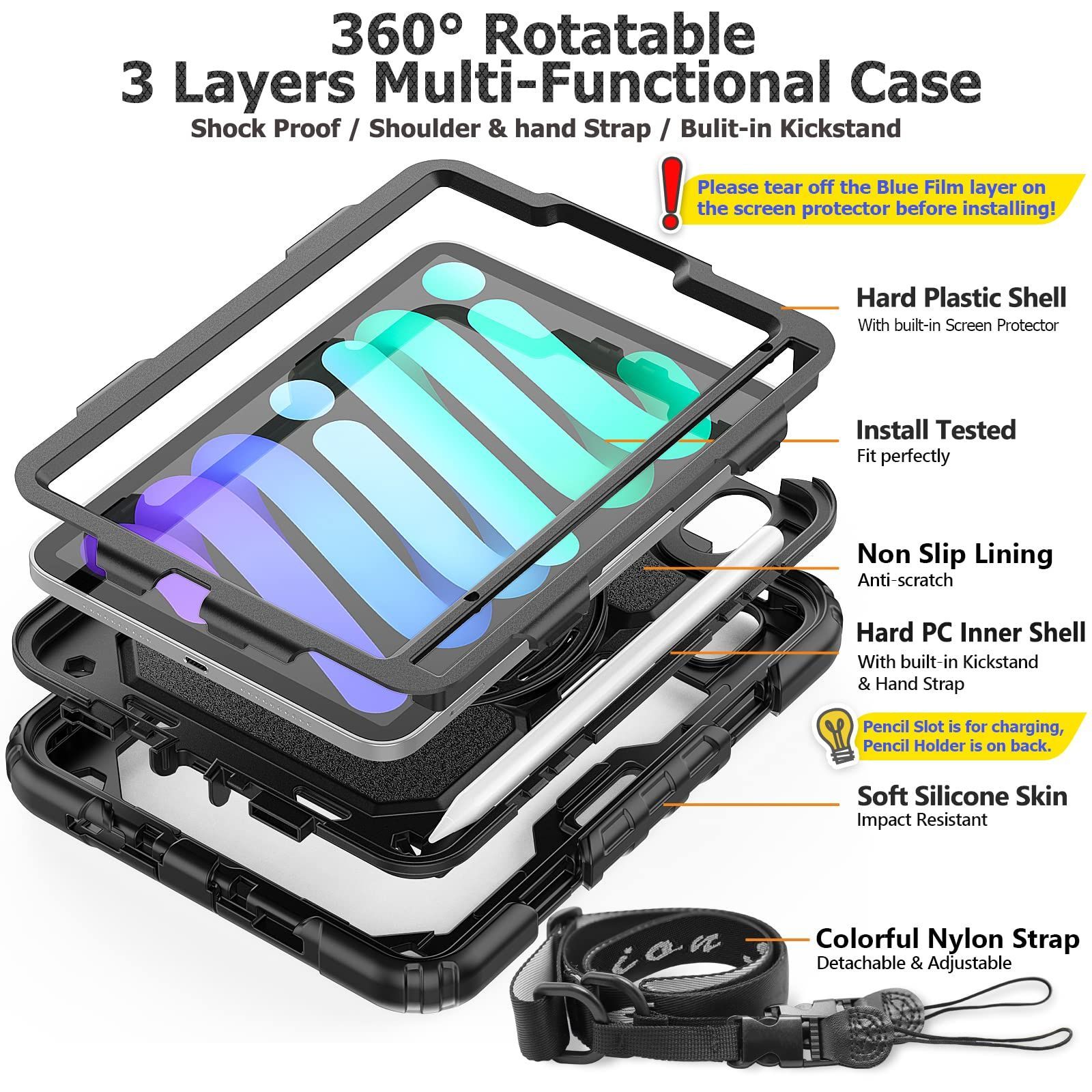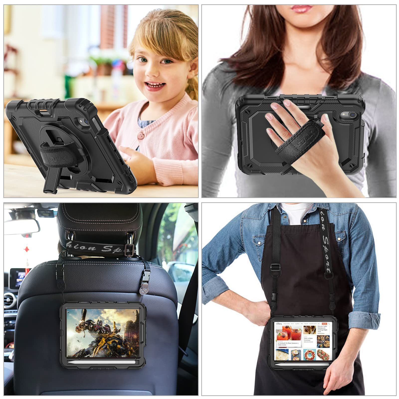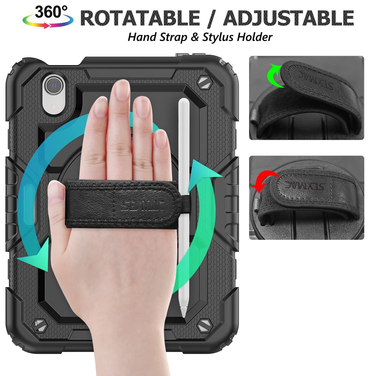 SEYMAC stock iPad mini 7/mini 6専用ケース 耐衝撃 ペンホルダー フィルム付き前面カバー 横置き縦置きスタンド 360度回転ハンドストラップ 肩掛けショルダーストラップ付きmini A17 Pro(ブラック)