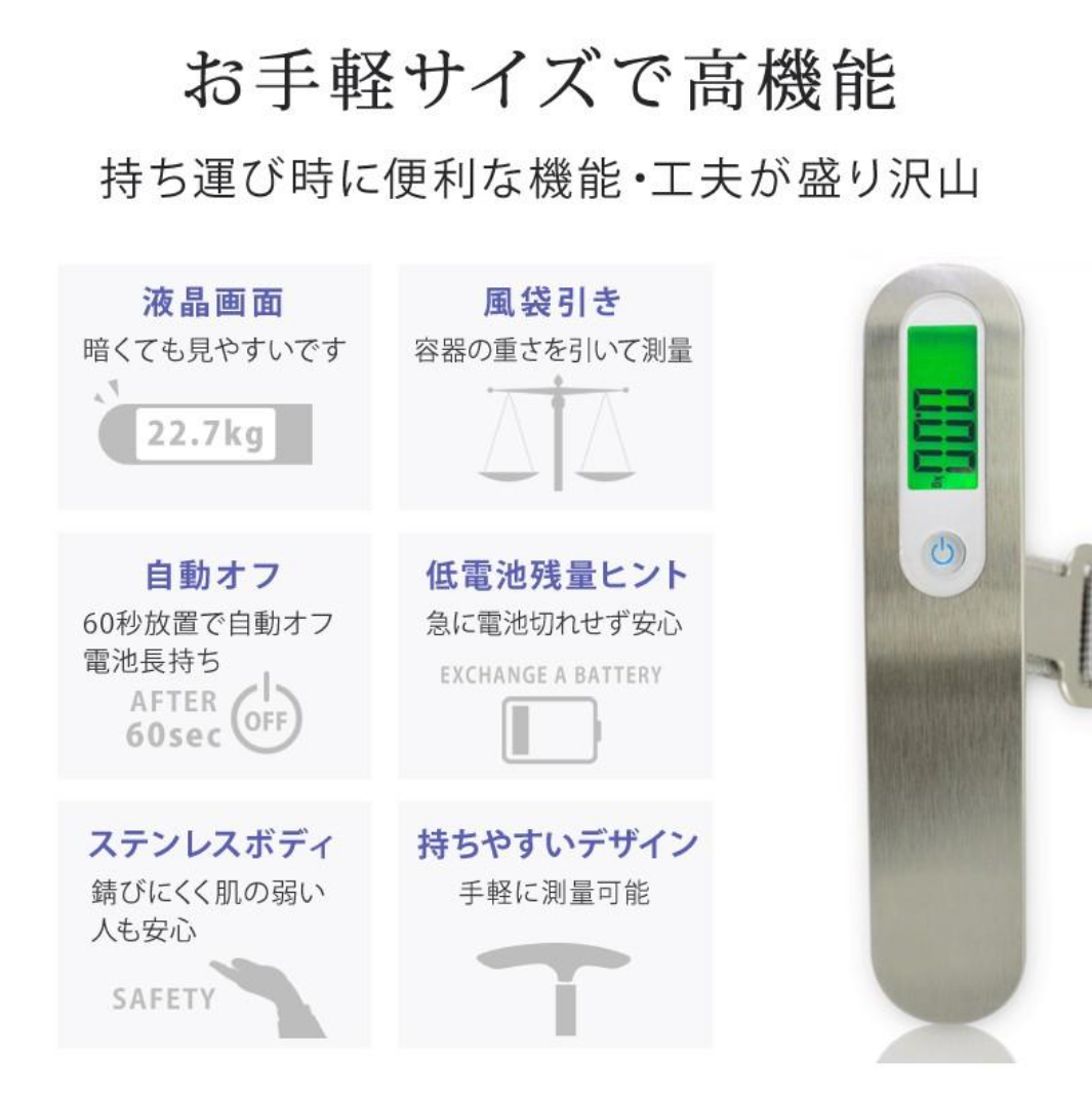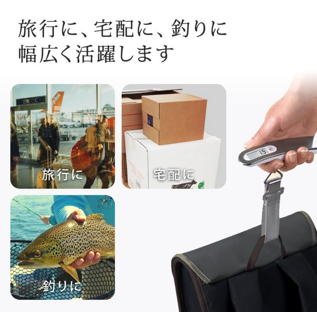 旅行や出張の際や、アウトドアの荷物の重さ測り、釣りの魚の重さ測りにとても便利な商品のご紹介です。