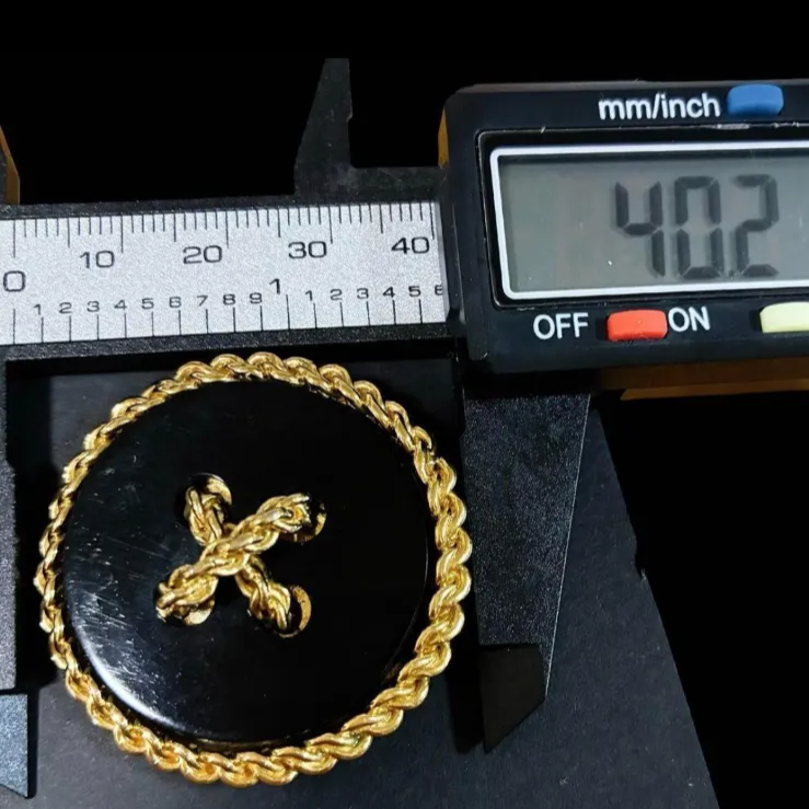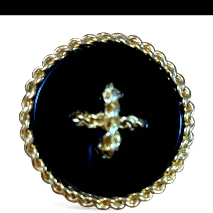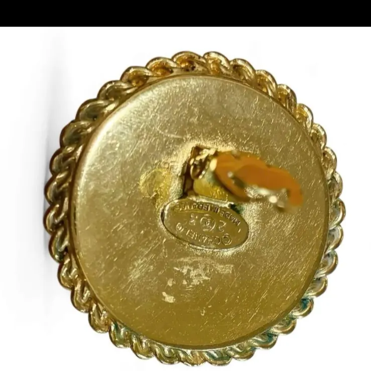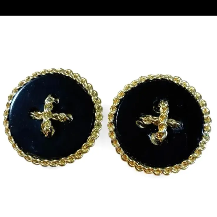 大きめサイズ(直径約40mm)のボタンモチーフで、ブラック×ゴールドのコントラストが高級感を演出します。縁取りと中央のロープ風デザインがクラシカルで存在感のある逸品です。