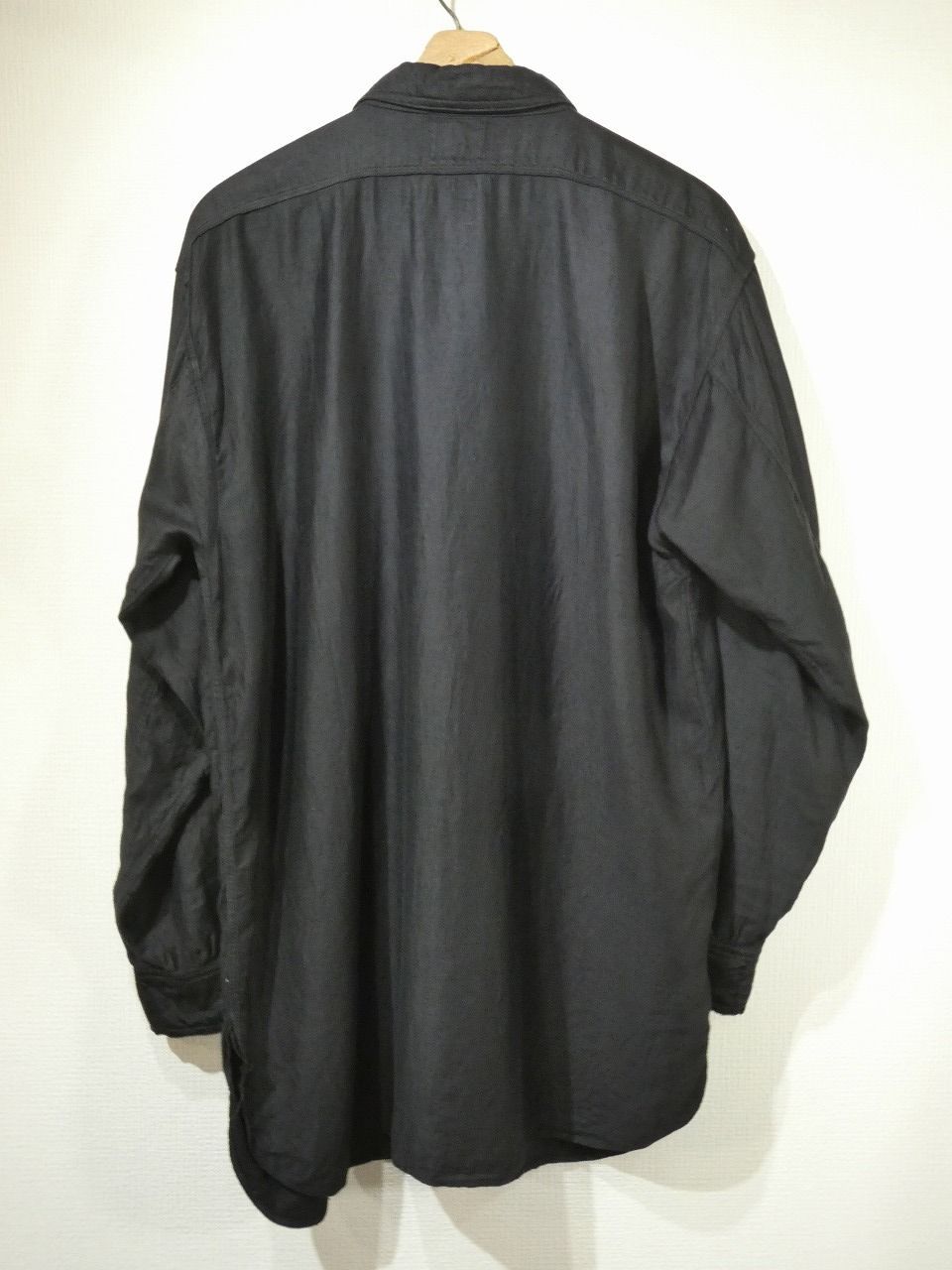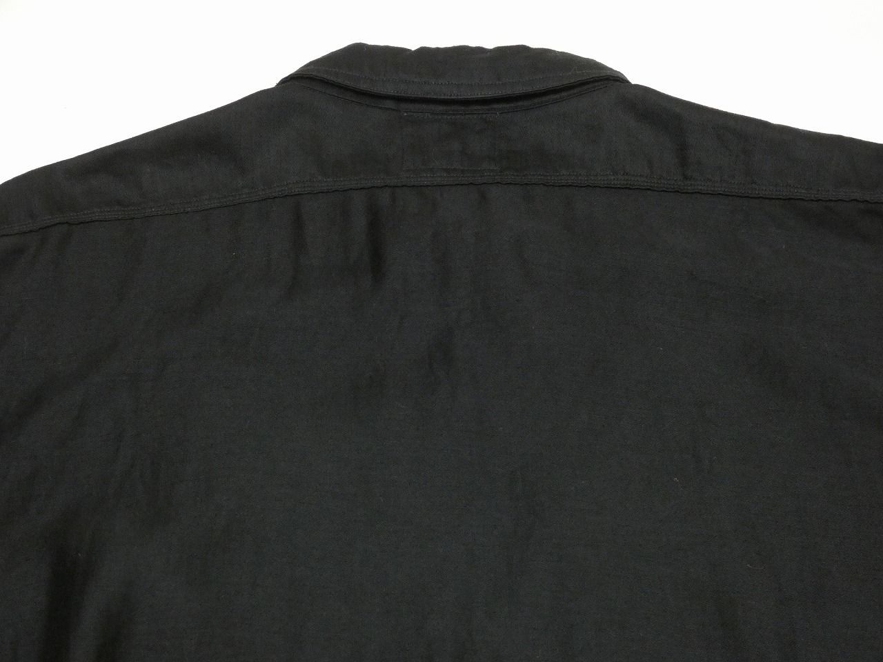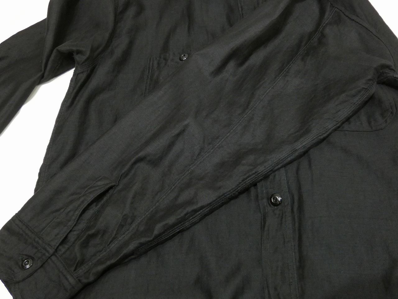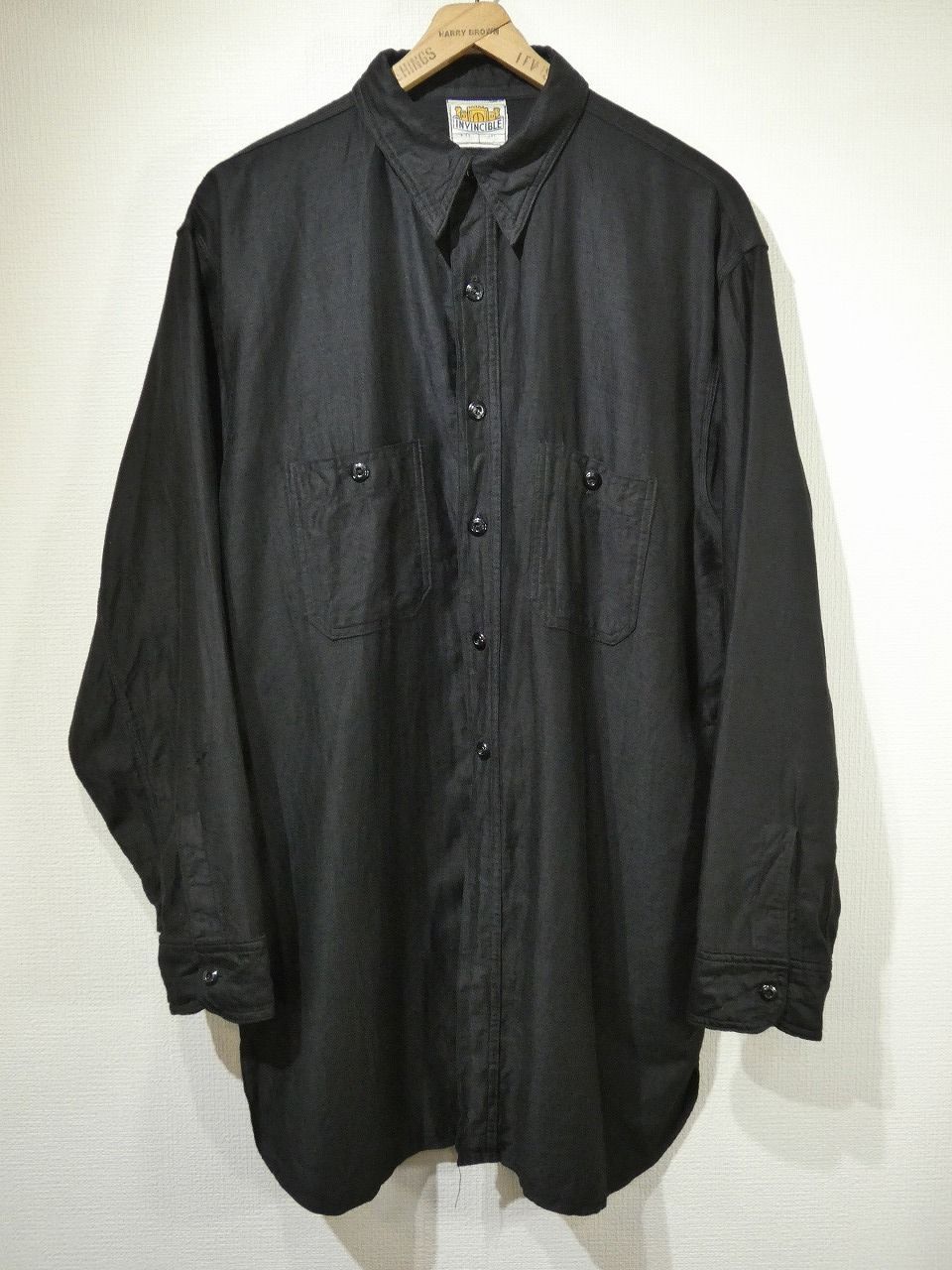 古いワークシャツでも本当に現存数の少ないブラックコットンサテンの1枚です。襟はダブルステッチで、その他はダブルと細かいピッチのトリプルステッチを使用しています。ボタンは黒ラッカーのメタルボタン、裾にはもちろんマチも付いています。タグもきれいに残っており、SIZEやLOTナンバーもかすかですが確認できます。INVINCIBLE(無敵)というブランドネームも最高です。古い年代のブラックカラーアイテムは染色技術なのか?劣悪な保管状況なのか?デッドストックの物などは経年保管により生地に埃などが詰まり水を通すと生地が粉々になってしまう物もあり、こちらの様にウォッシュされている物は安心です。大きいサイスも魅力的だと思います。着用はもちろん、コレクションやデザインソースなどにもお勧めです。探されていた方は是非、ご検討下さい。