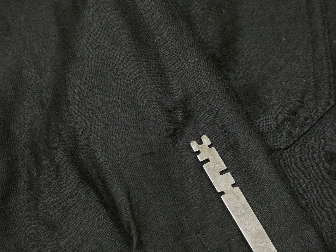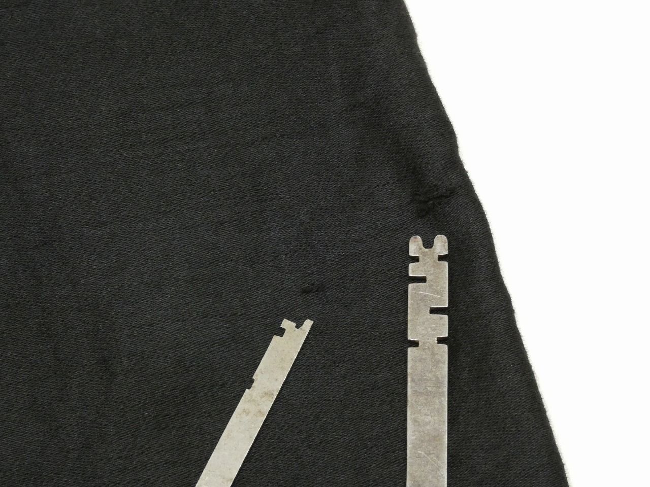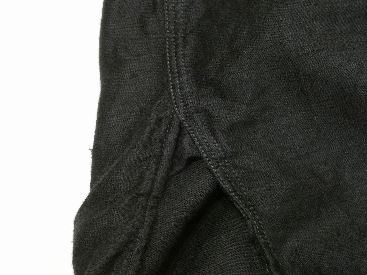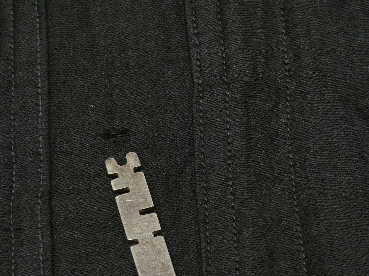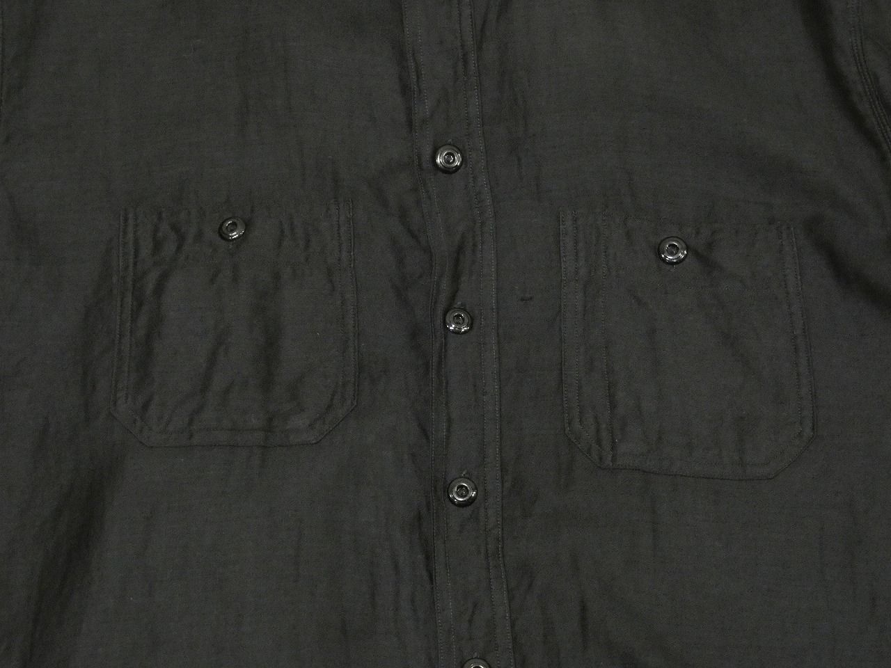 古いワークシャツでも本当に現存数の少ないブラックコットンサテンの1枚です。襟はダブルステッチで、その他はダブルと細かいピッチのトリプルステッチを使用しています。ボタンは黒ラッカーのメタルボタン、裾にはもちろんマチも付いています。タグもきれいに残っており、SIZEやLOTナンバーもかすかですが確認できます。INVINCIBLE(無敵)というブランドネームも最高です。古い年代のブラックカラーアイテムは染色技術なのか?劣悪な保管状況なのか?デッドストックの物などは経年保管により生地に埃などが詰まり水を通すと生地が粉々になってしまう物もあり、こちらの様にウォッシュされている物は安心です。大きいサイスも魅力的だと思います。着用はもちろん、コレクションやデザインソースなどにもお勧めです。探されていた方は是非、ご検討下さい。