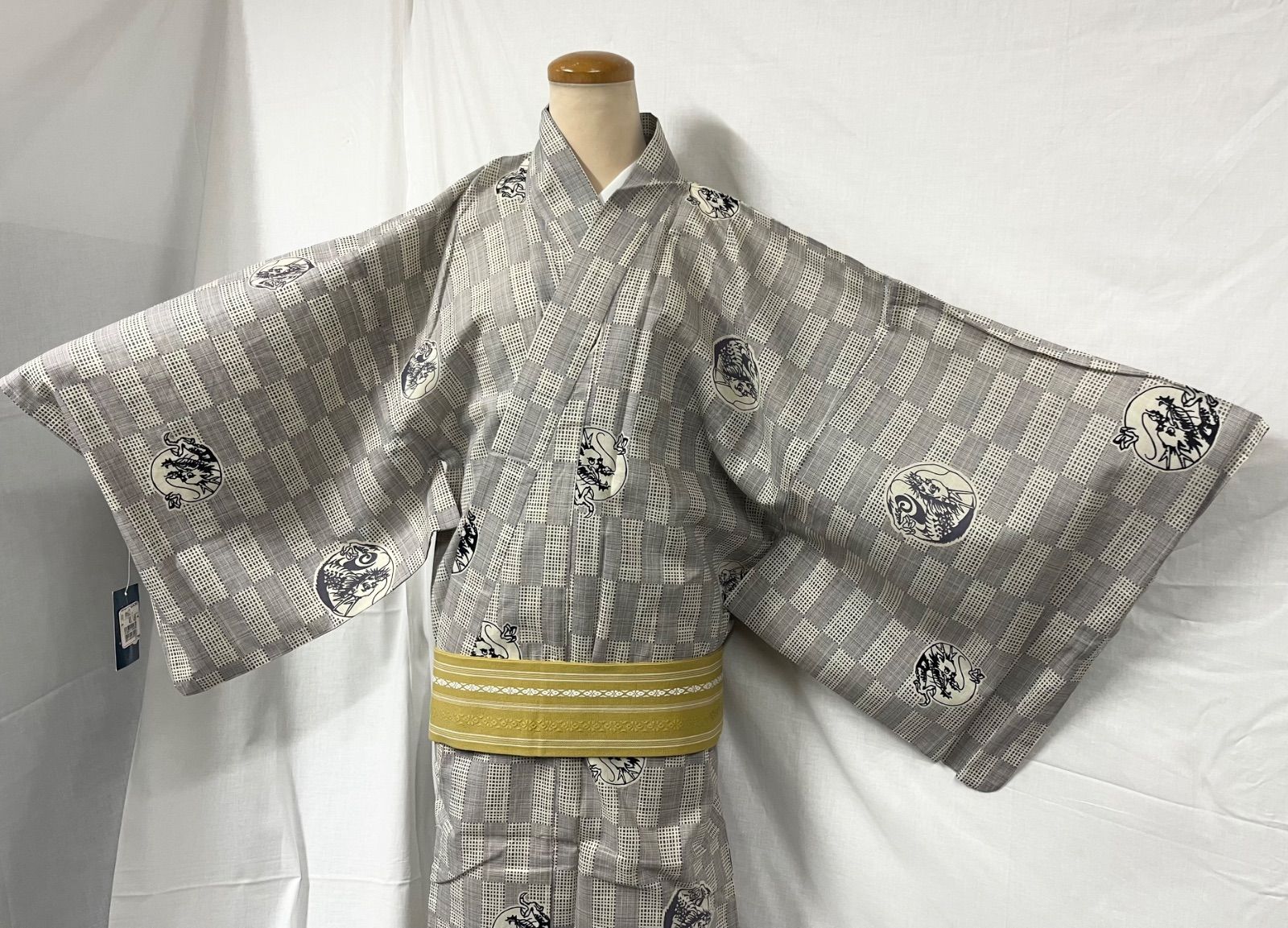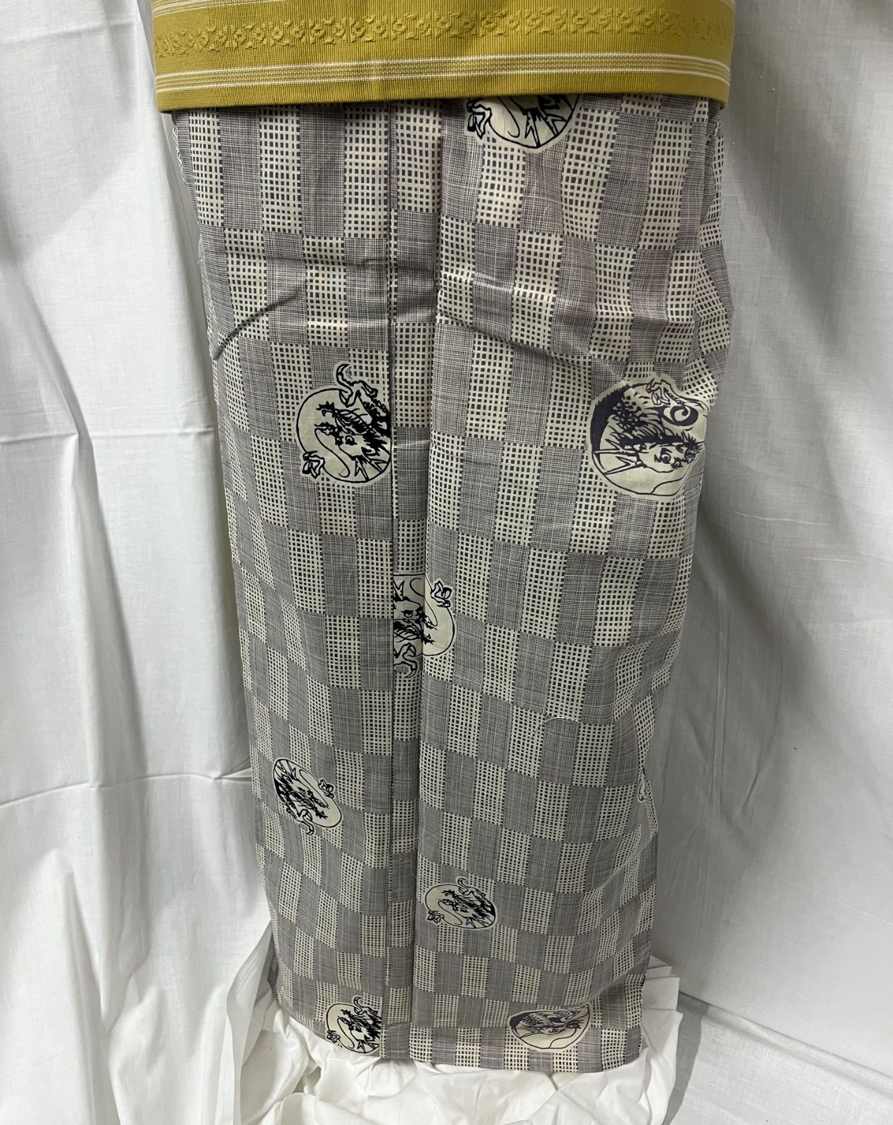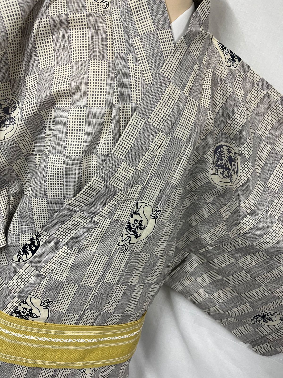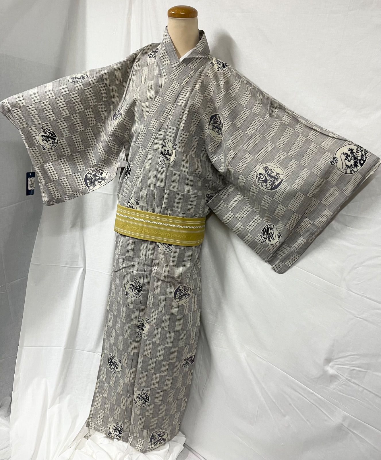 新品未使用 匿名配送 浴衣 メンズ グレー 市松模様 龍文様 総柄 模様 LL サイズ