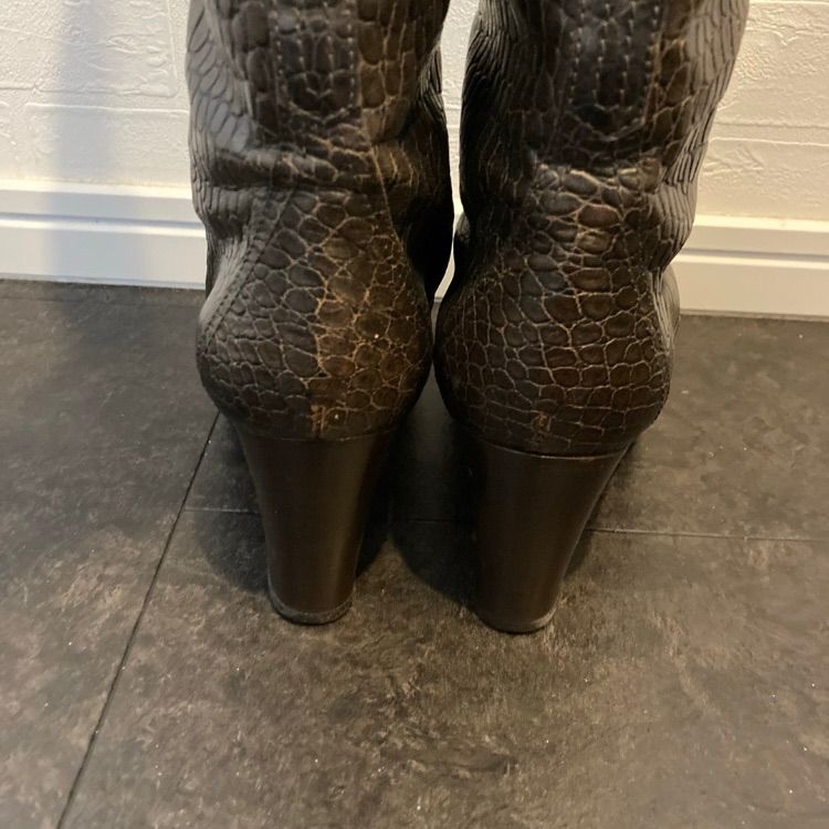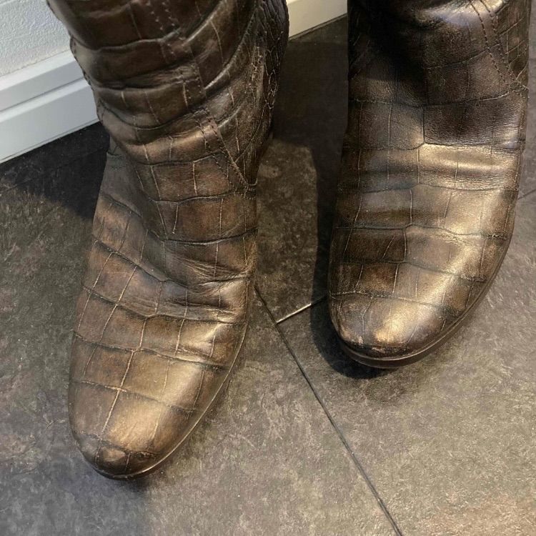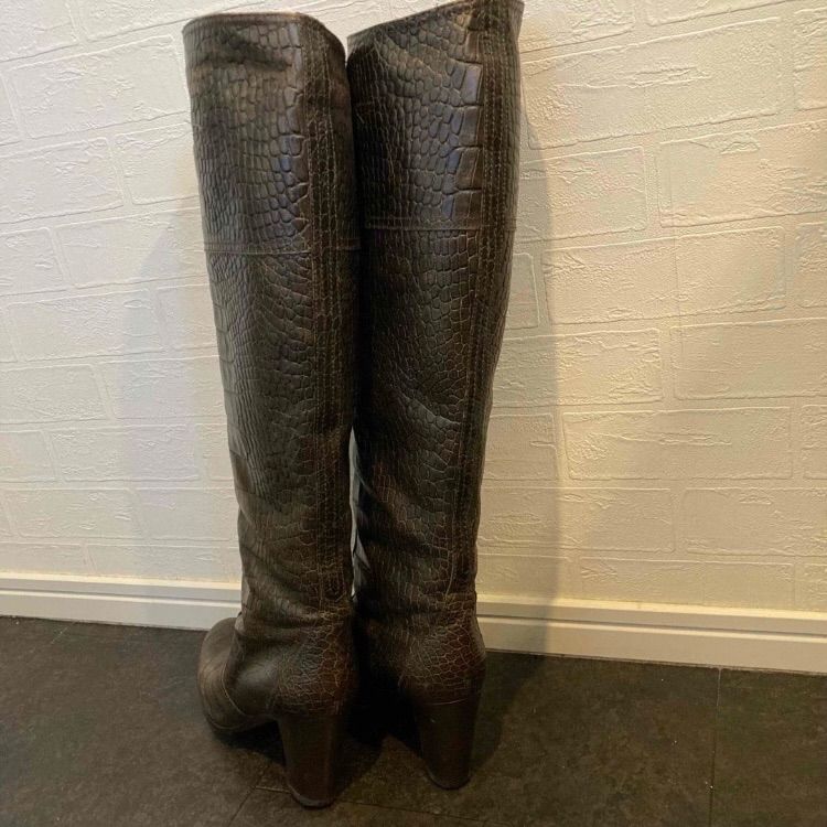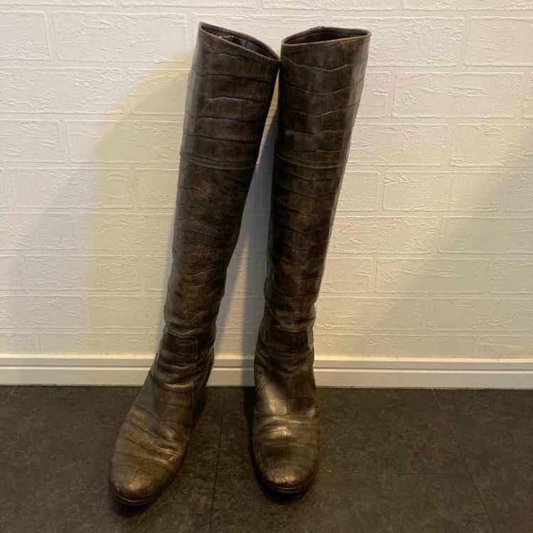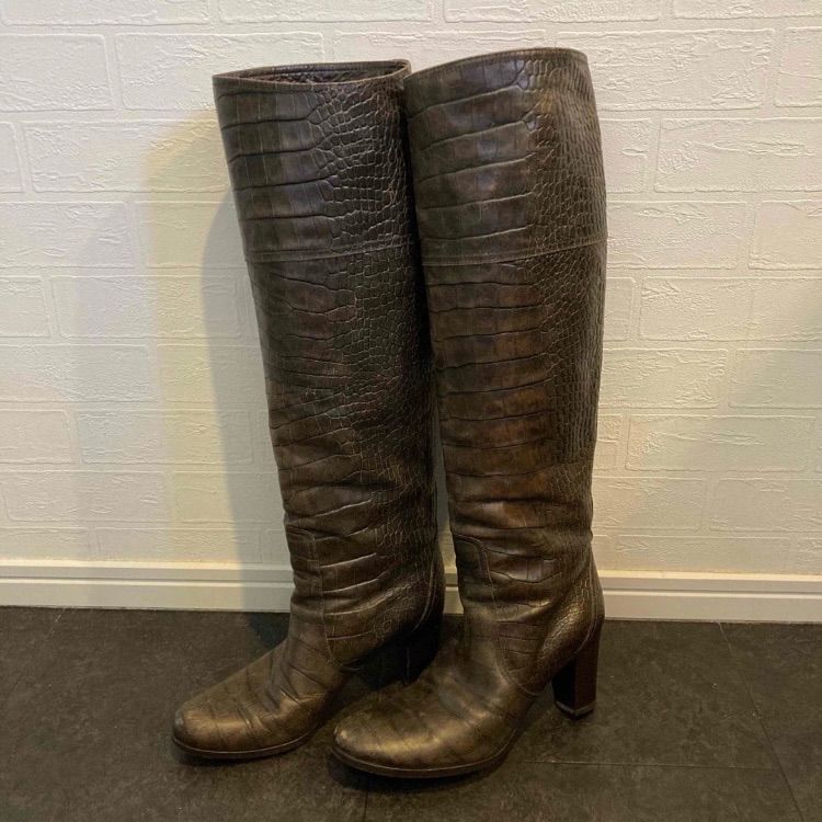 クロコの型押し素材が高級感溢れるラグジュアリーな雰囲気を醸しだすロングブーツです。
