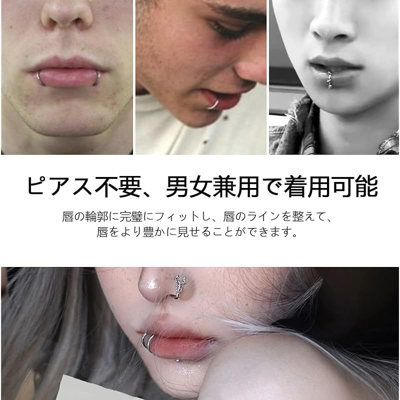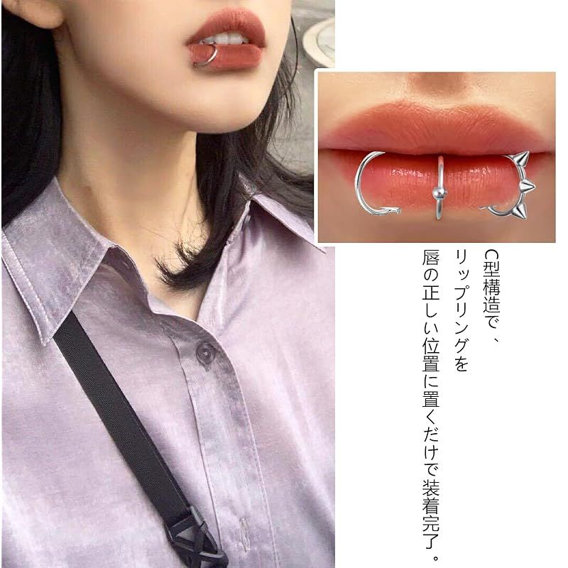 【リップリング】パンチングなしで簡単に装着できる。C型構造で、リップリングを唇の正しい位置に置くだけで装着完了。唇の輪郭に完璧にフィットし、唇のラインを整えて、唇をより豊かに見せることができます。