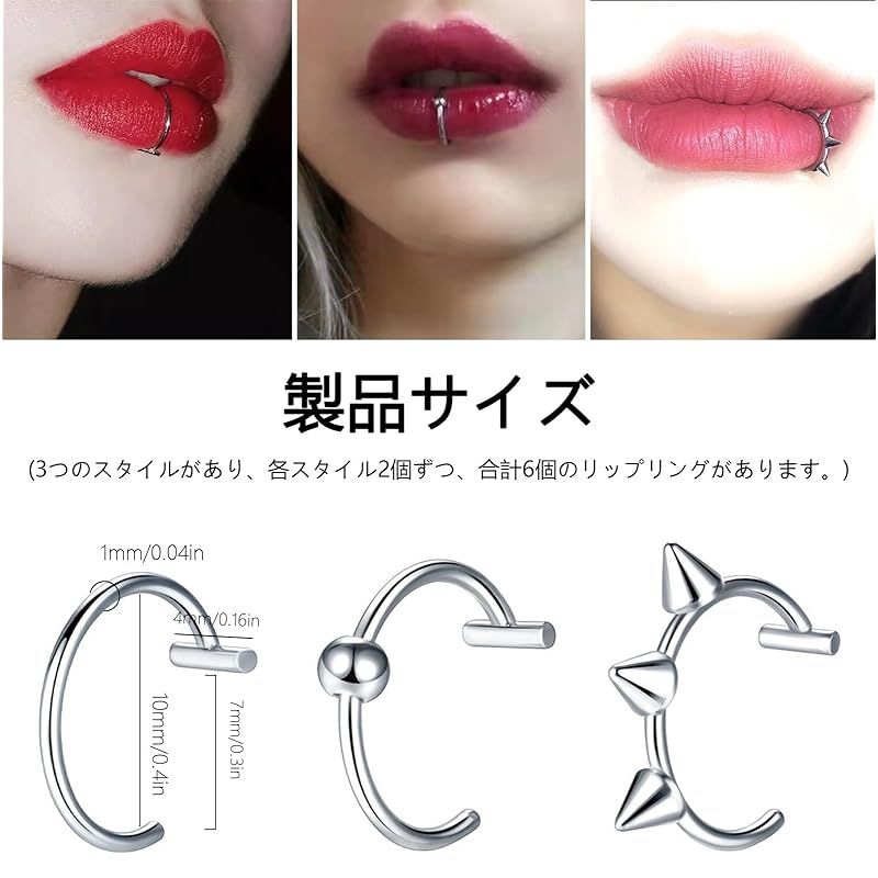 【商品仕様】3つのスタイルがあり、各スタイル2個ずつ、合計6個のリップリングがあります。サイズ:内径10mm、厚さ1mm、開口部7mm。