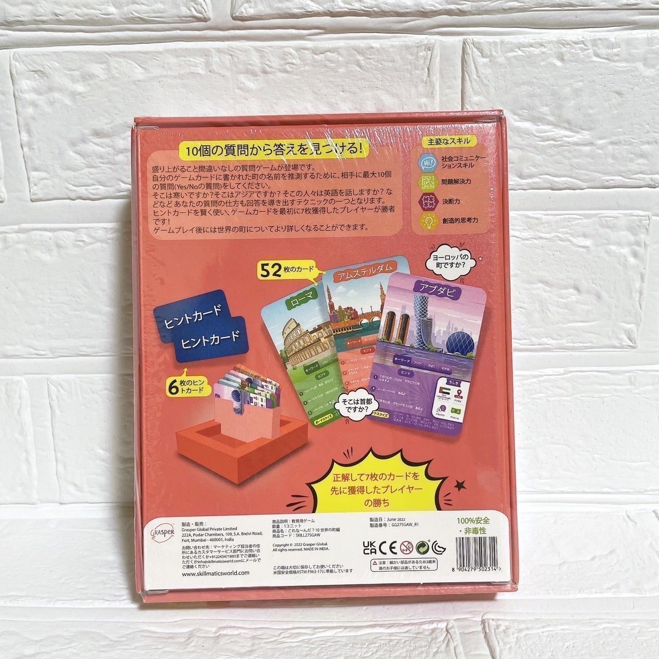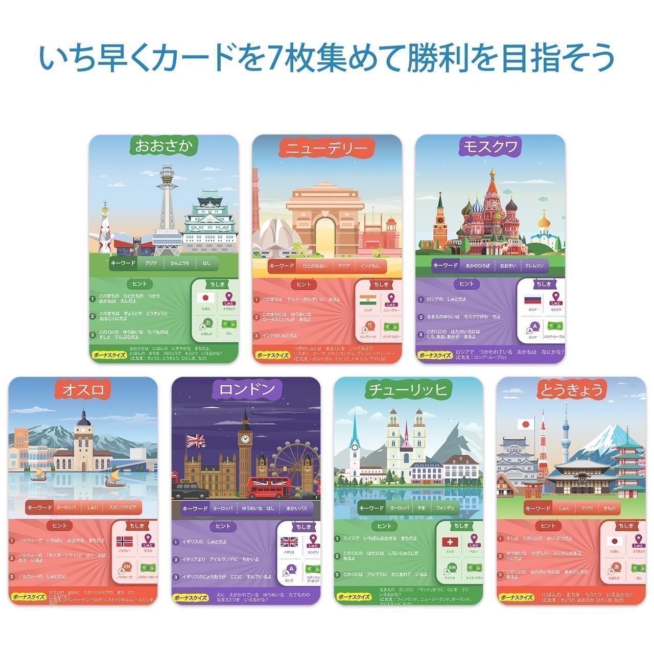 質問ゲーム: ゲーム カードに書かれた国に関する 10 個の質問に回答します。都市はアジアにありますか? 観光地ですか? 国の首都ですか? よく考えて賢く質問し、ヒント カードを賢く使用してください。最初に 7 枚のゲーム カードを集めた人が勝者になります。
