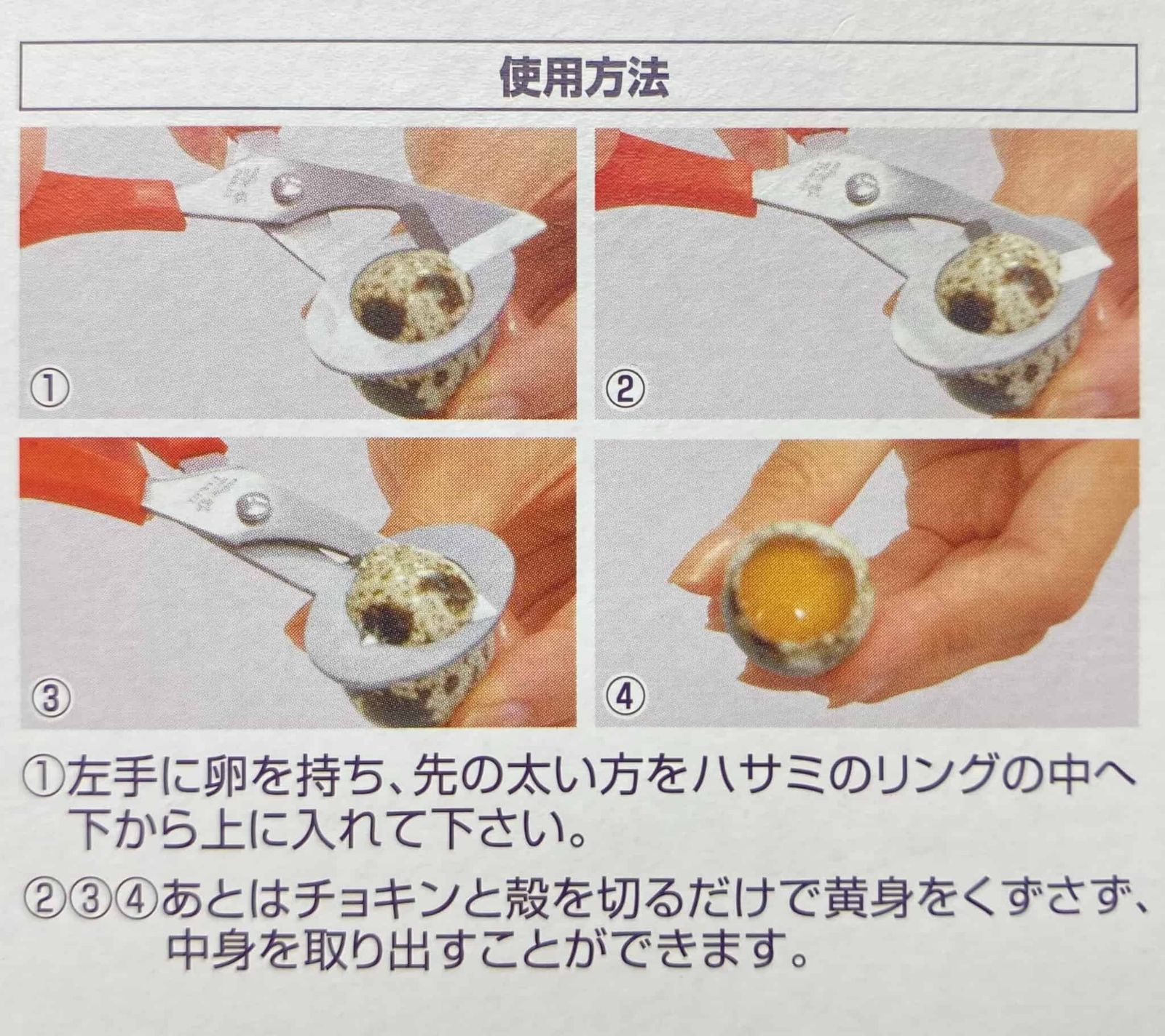 うずらの卵の上部を鋏で挟み、チョキンと殻を切るだけで、そのまま逆さにすれば黄身もくずれることなく取り出せます。