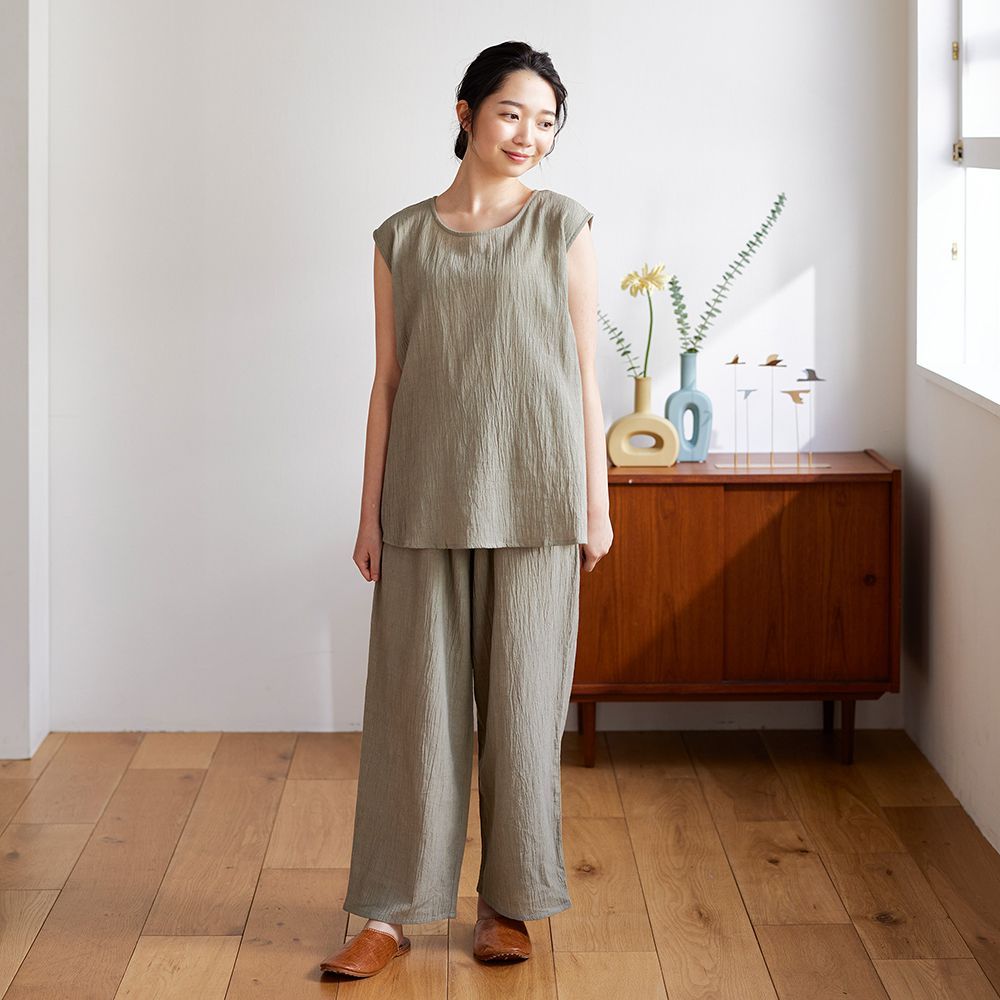 セットアップ使いも、単品でも着用できるルームウェア。コットンリネンの軽やかな生地感で、宅配便の対応やちょっとコンビニまでにも対応したデザインです。