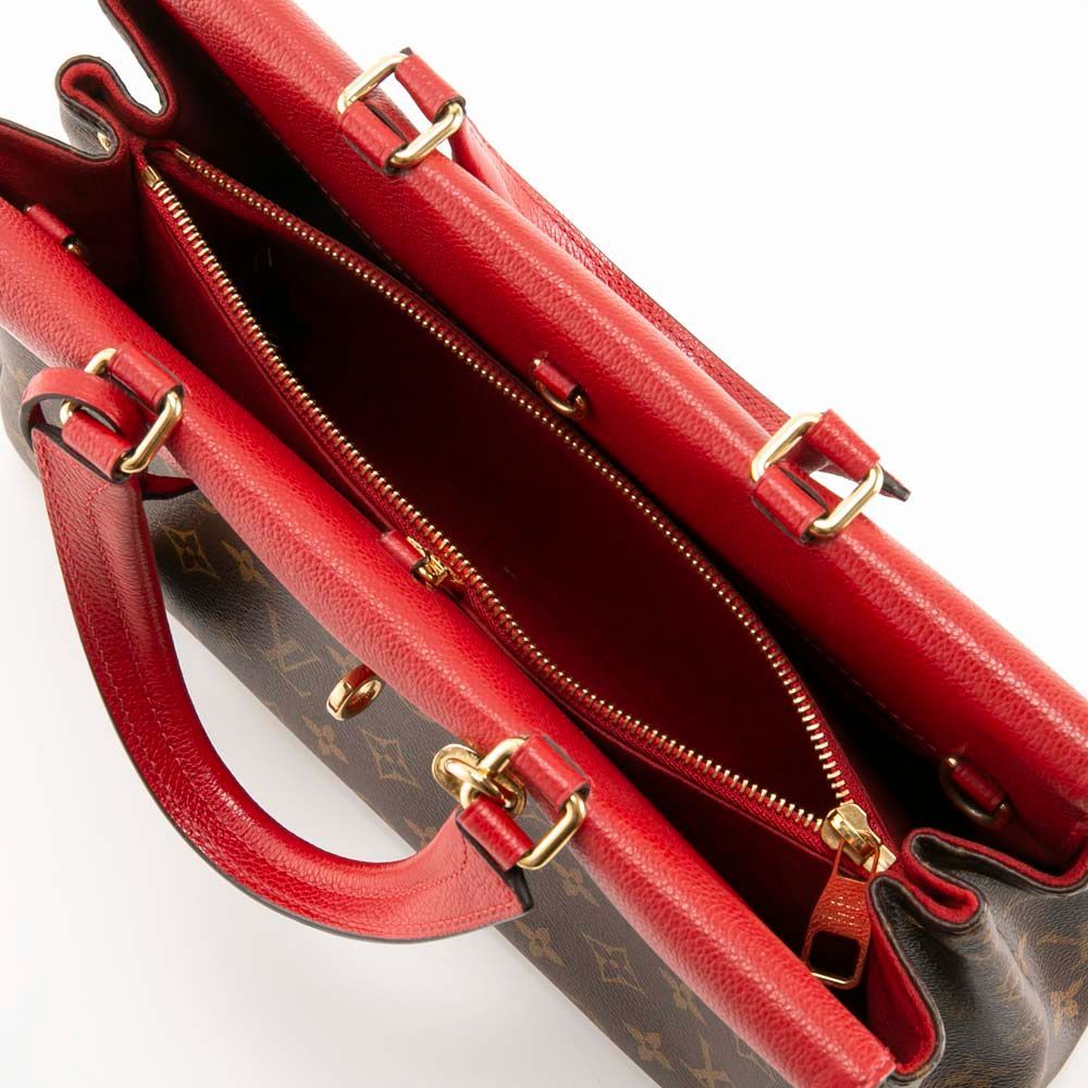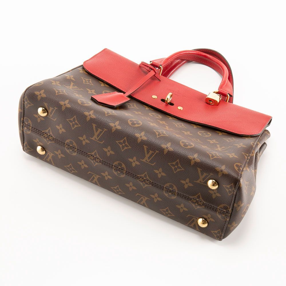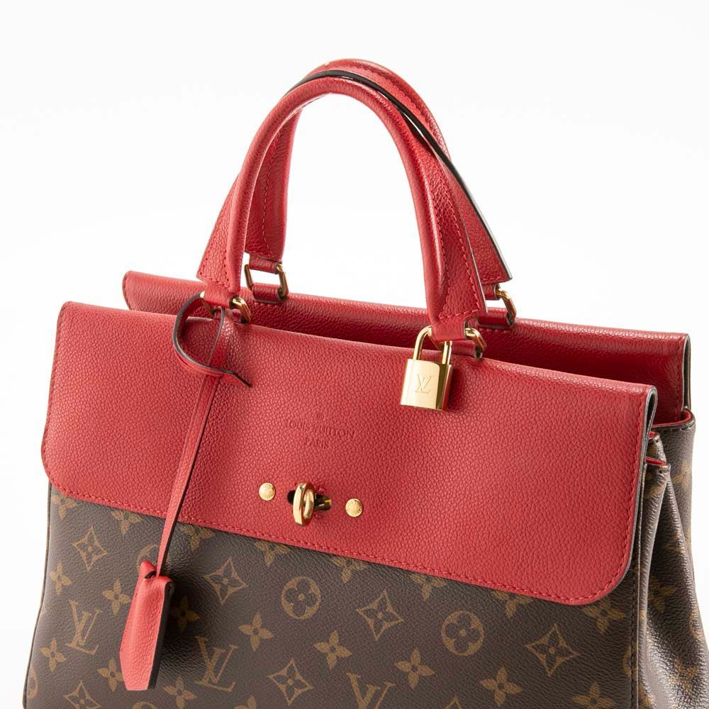 ブラウンカラーのモノグラム柄にレッドカラーのフラップと持ち手がアクセントになったハンドバッグです。