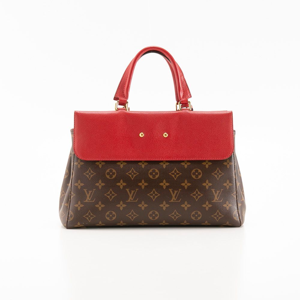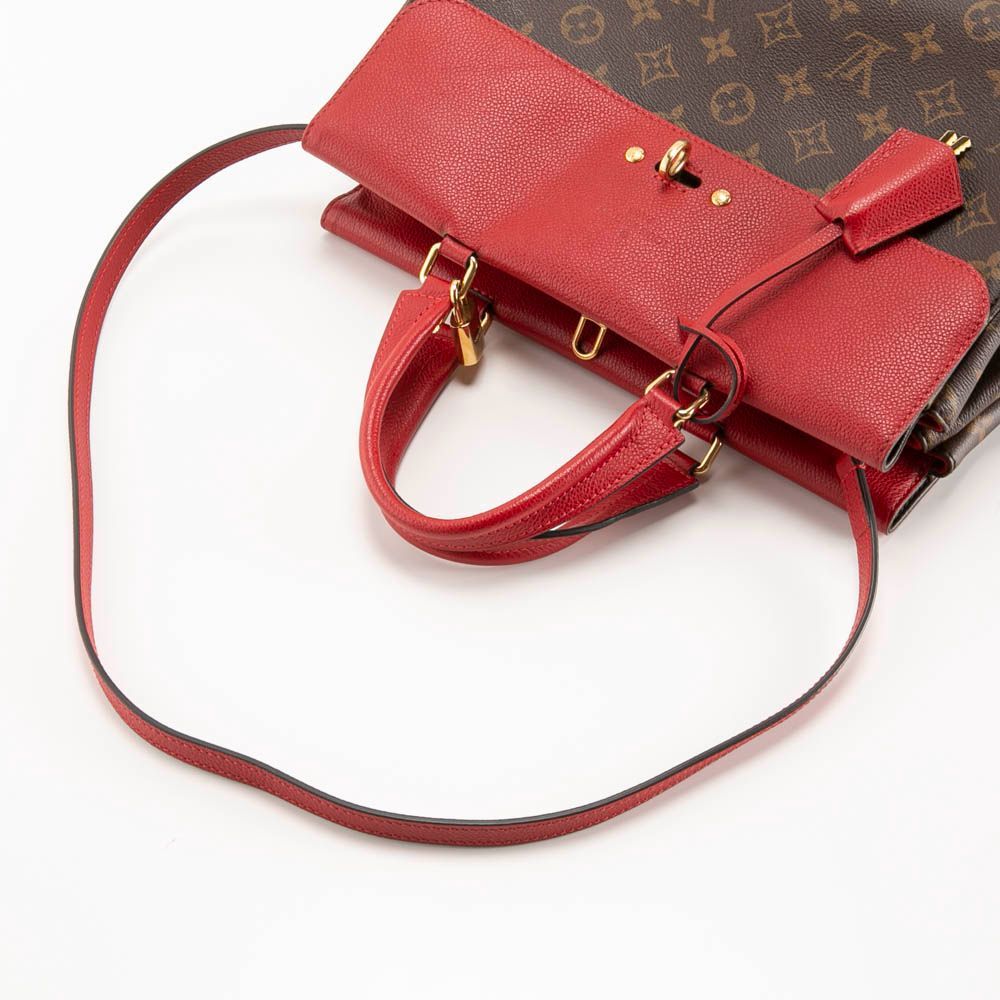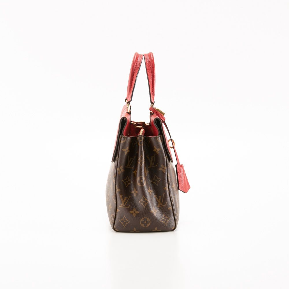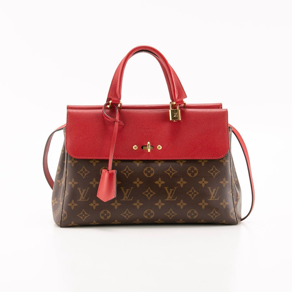 ブラウンカラーのモノグラム柄にレッドカラーのフラップと持ち手がアクセントになったハンドバッグです。